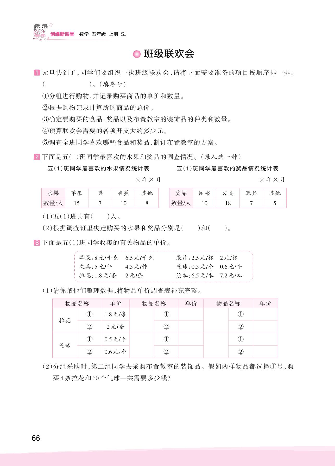 2023上册五年级数学苏教版 五 小数乘法和除法——班级联欢会