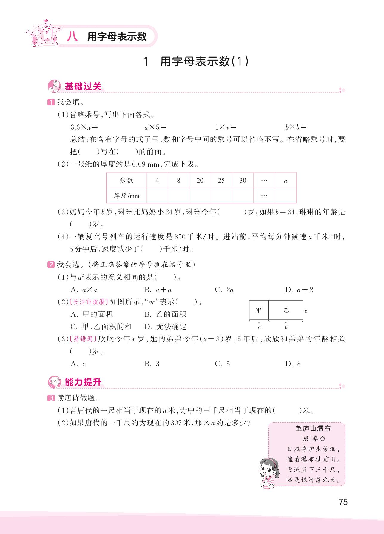 2023上册五年级数学苏教版 八 用字母表示数——1 用字母表示数(1)