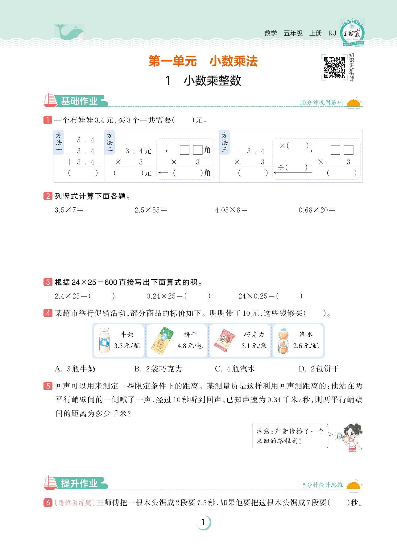 2023上册五年级数学人教版 第一单元 小数乘法——1 小数乘整数
