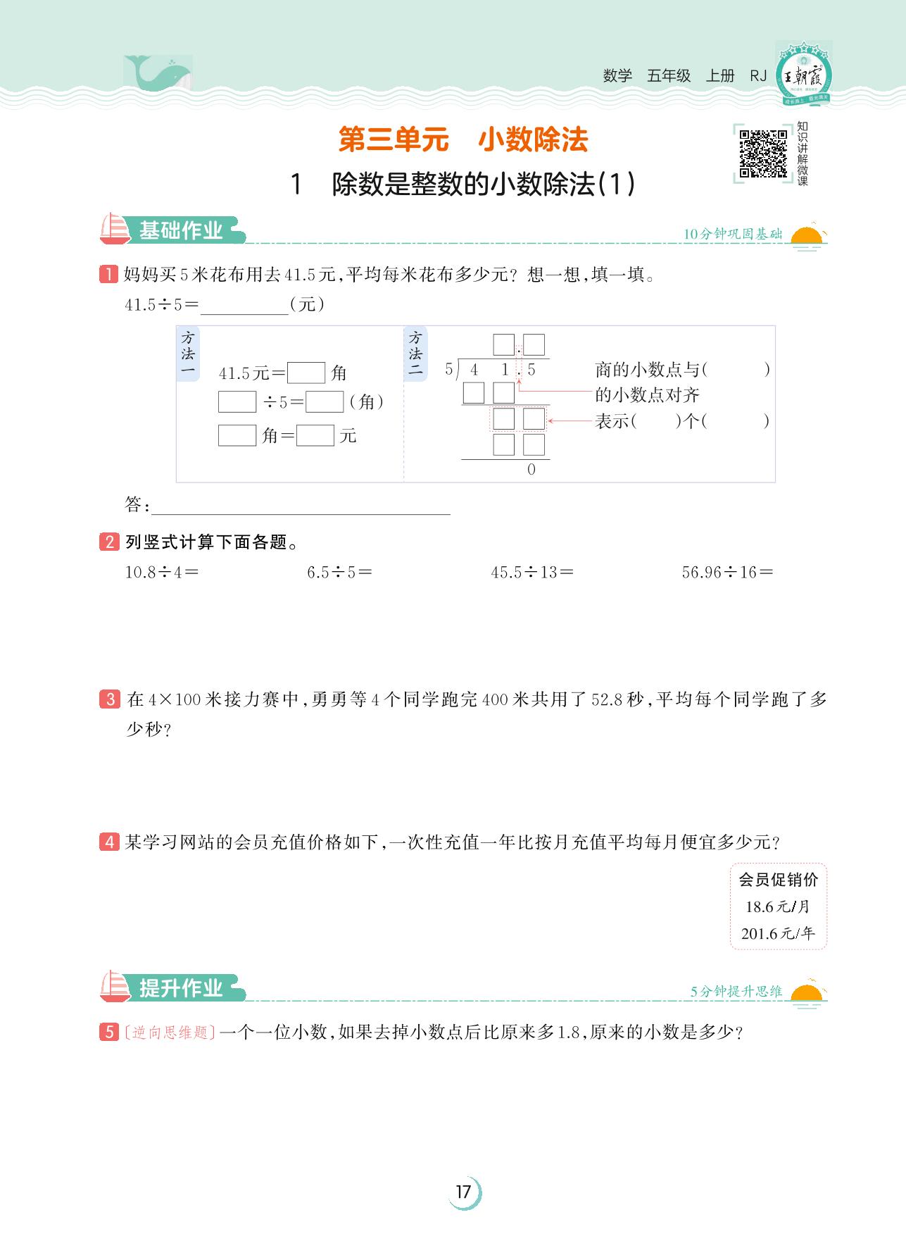 2023上册五年级数学人教版 第三单元 小数除法——1 除数是整数的小数除法(1)