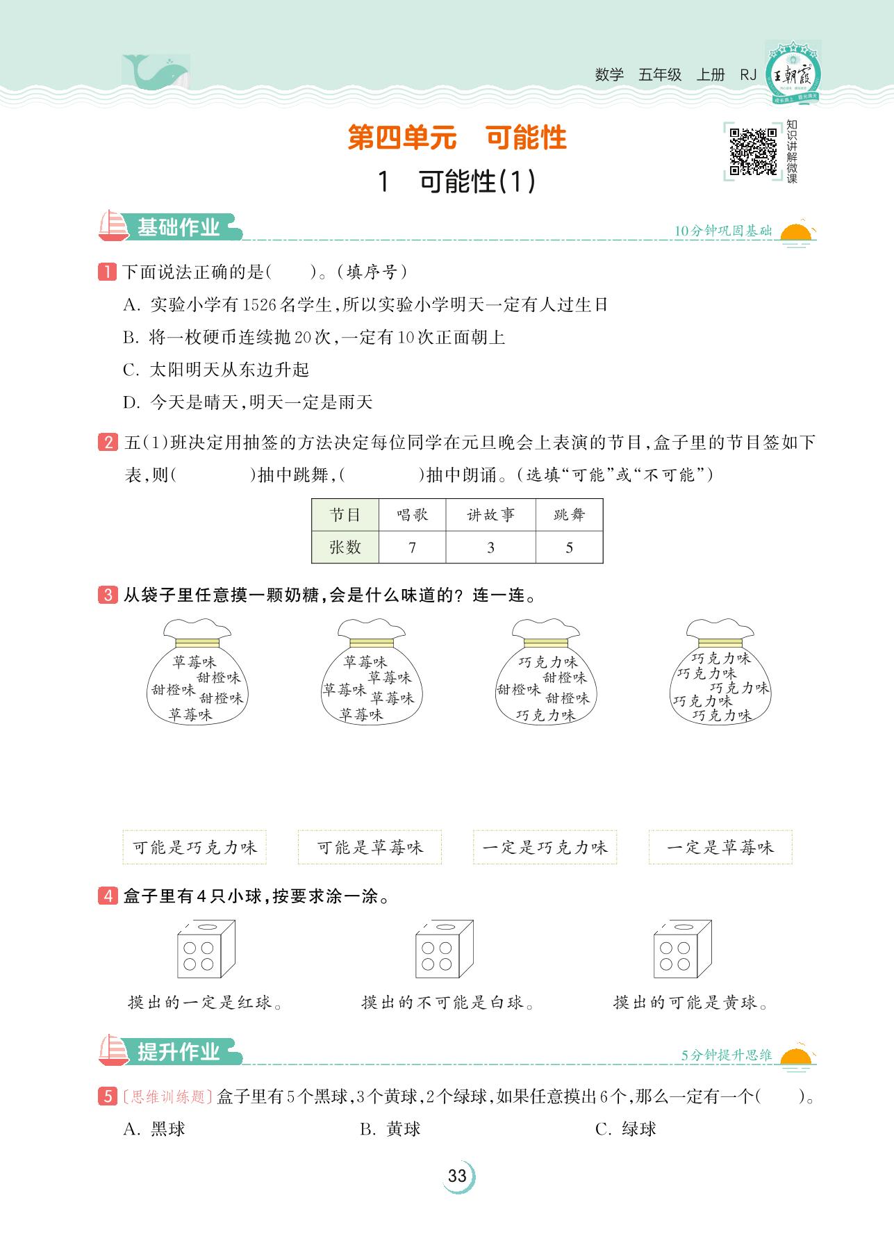 2023上册五年级数学人教版 第四单元 可能性——1 可能性(1)