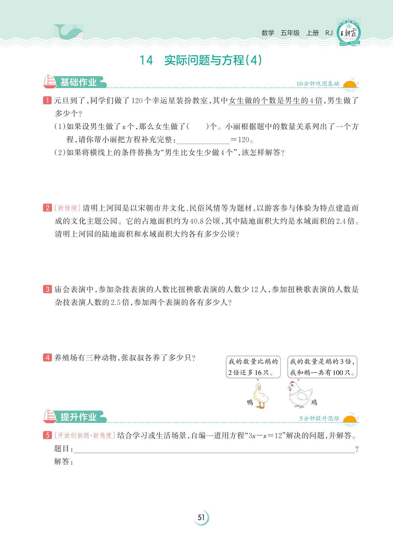 2023上册五年级数学人教版 第五单元 简易方程——14 实际问题与方程(4)