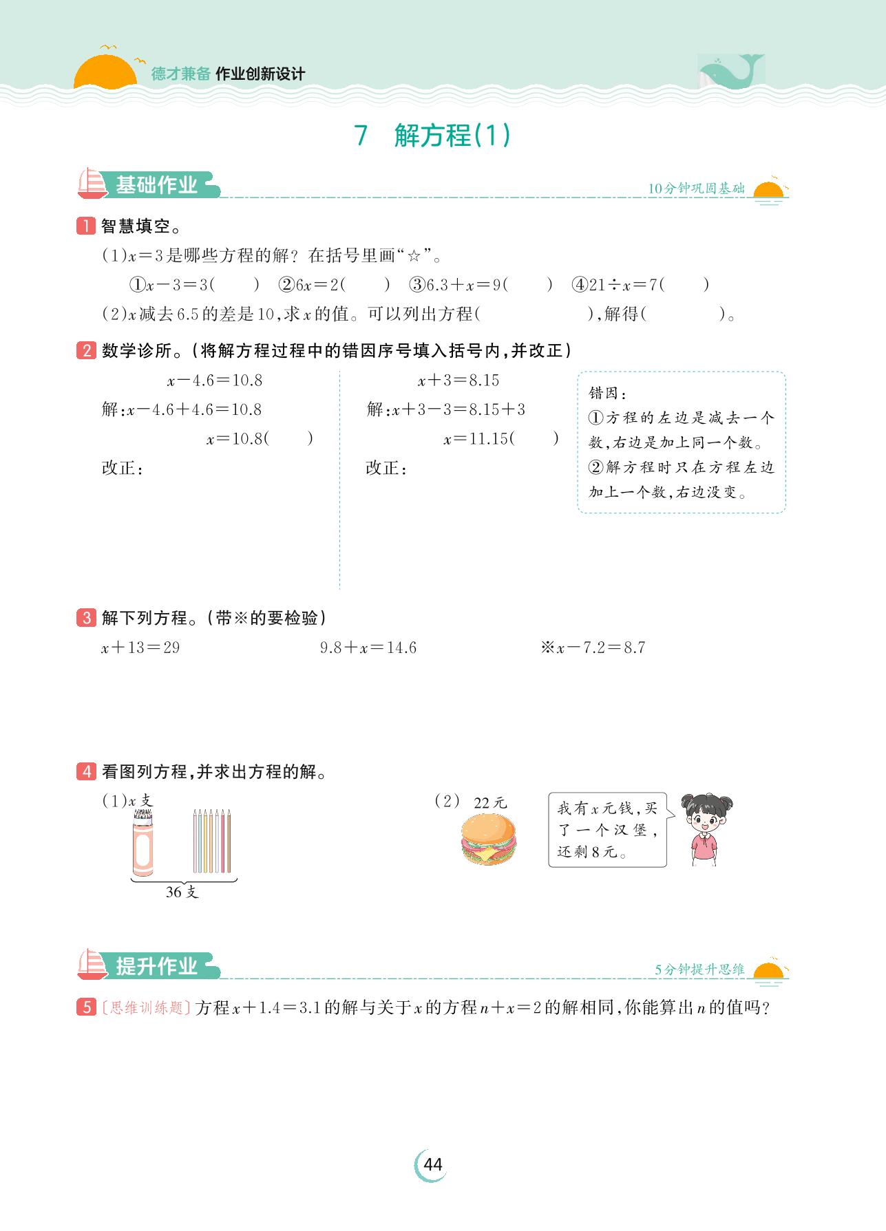2023上册五年级数学人教版 第五单元 简易方程——7 解方程(1)