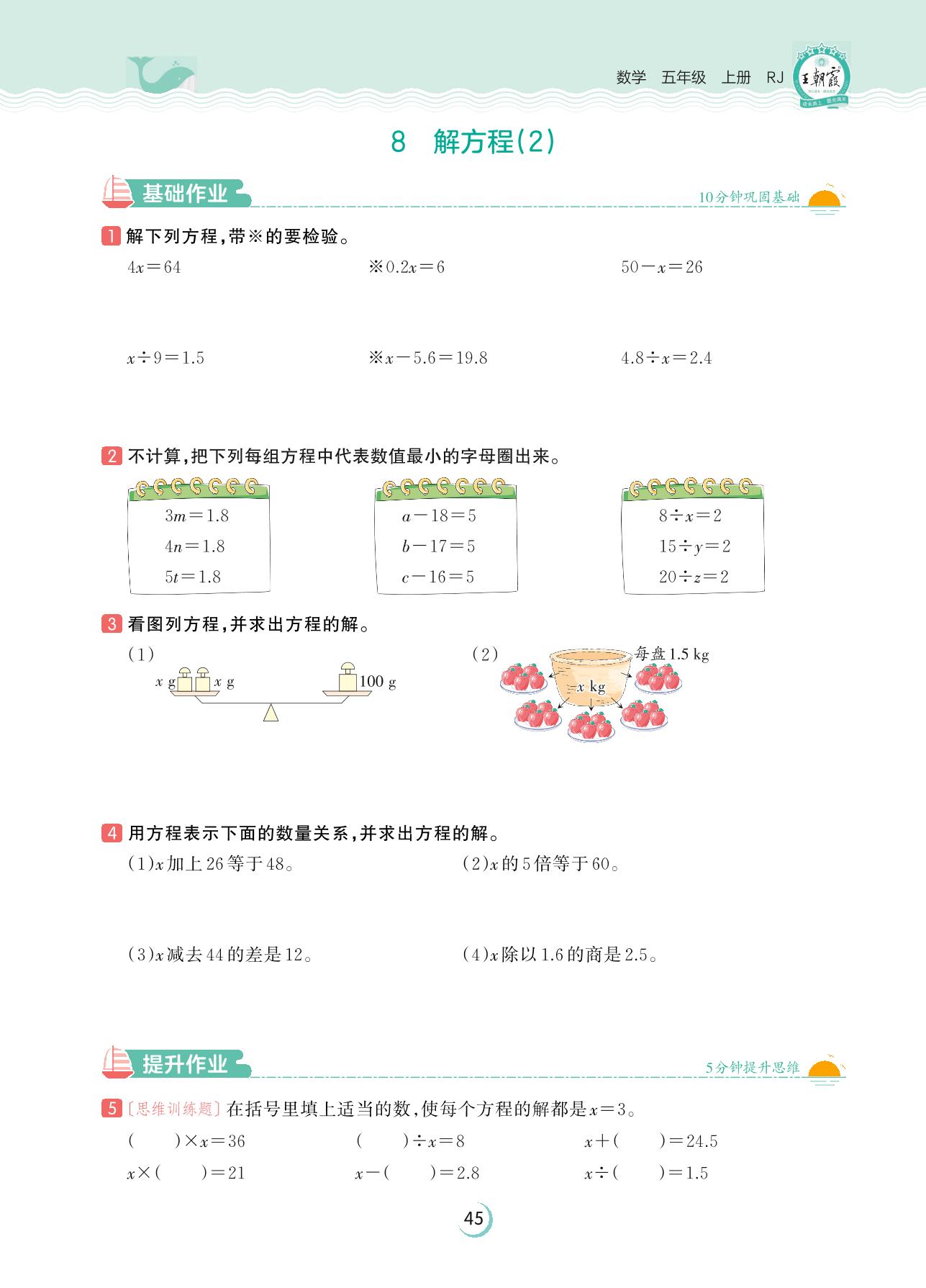 2023上册五年级数学人教版 第五单元 简易方程——8 解方程(2)