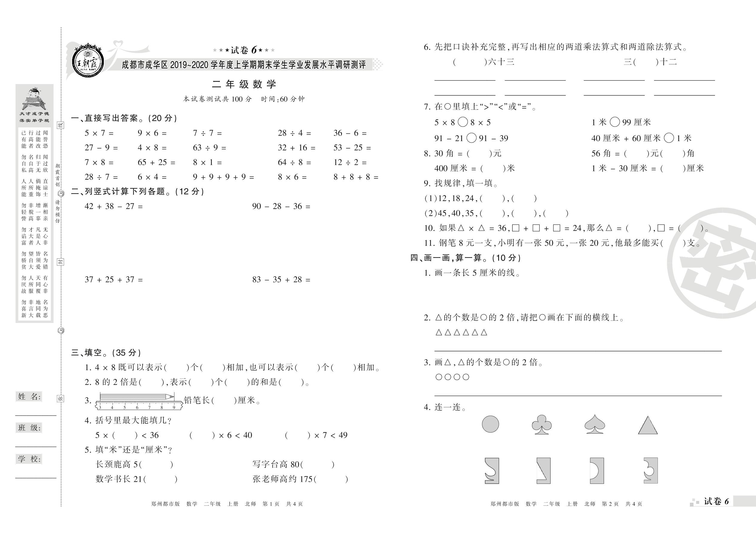2019-2020学年第一学期成都市成华区二年级数学试卷(北师版)【6】