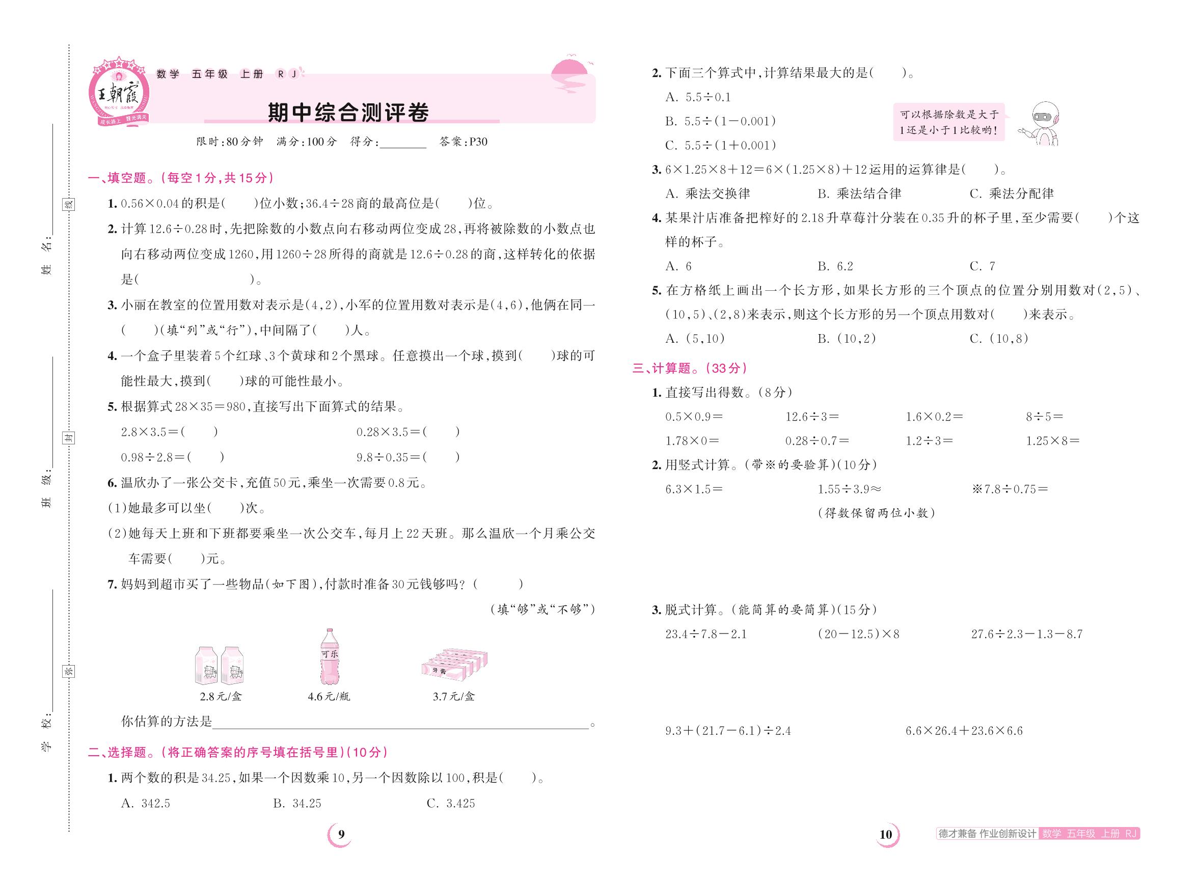 五年级数学人教版上册期中卷
