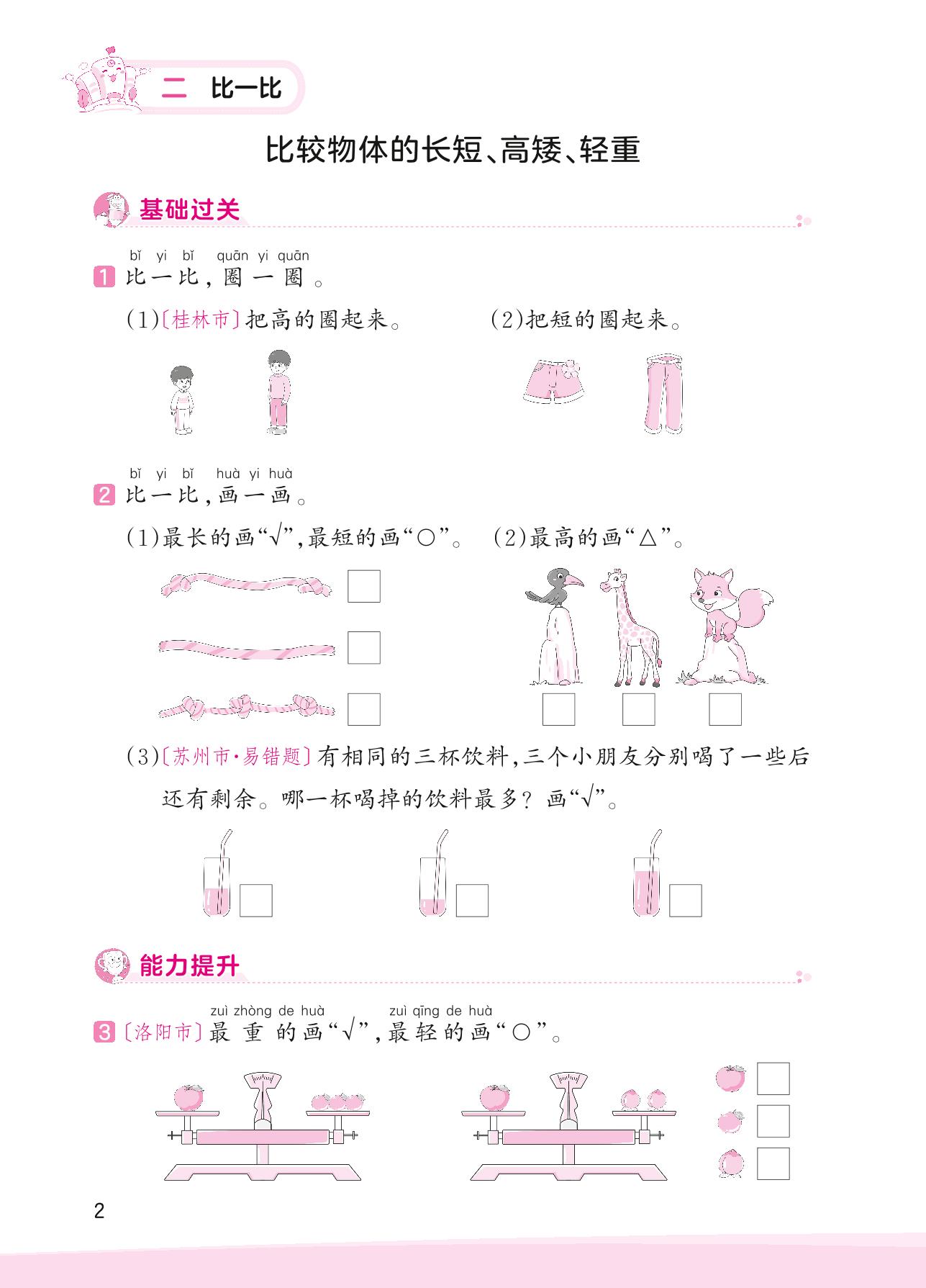 2023上册一年级数学苏教版 二 比一比 ——比较物体的长短、高矮、轻重
