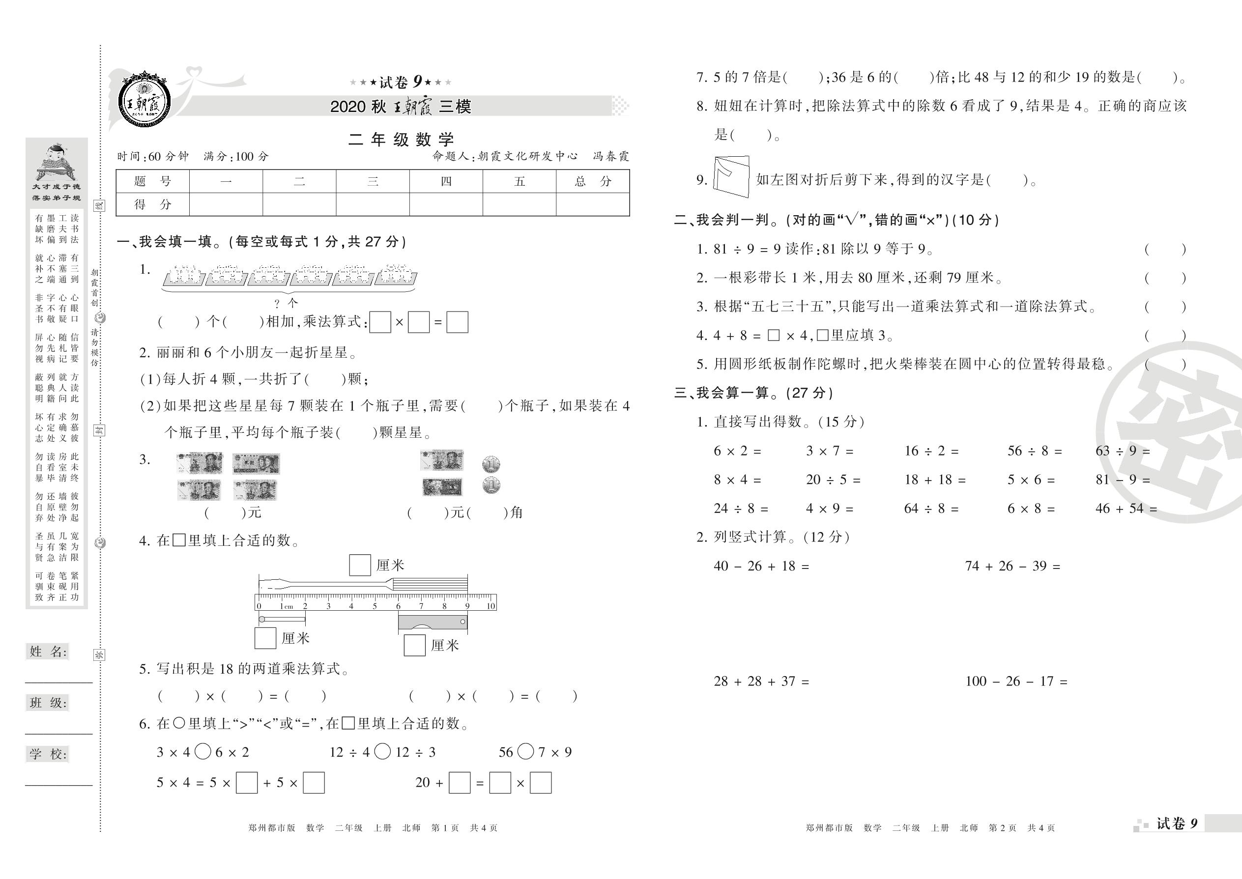 王朝霞期末模拟卷二年级上册数学(北师版)_R21080390028【9】