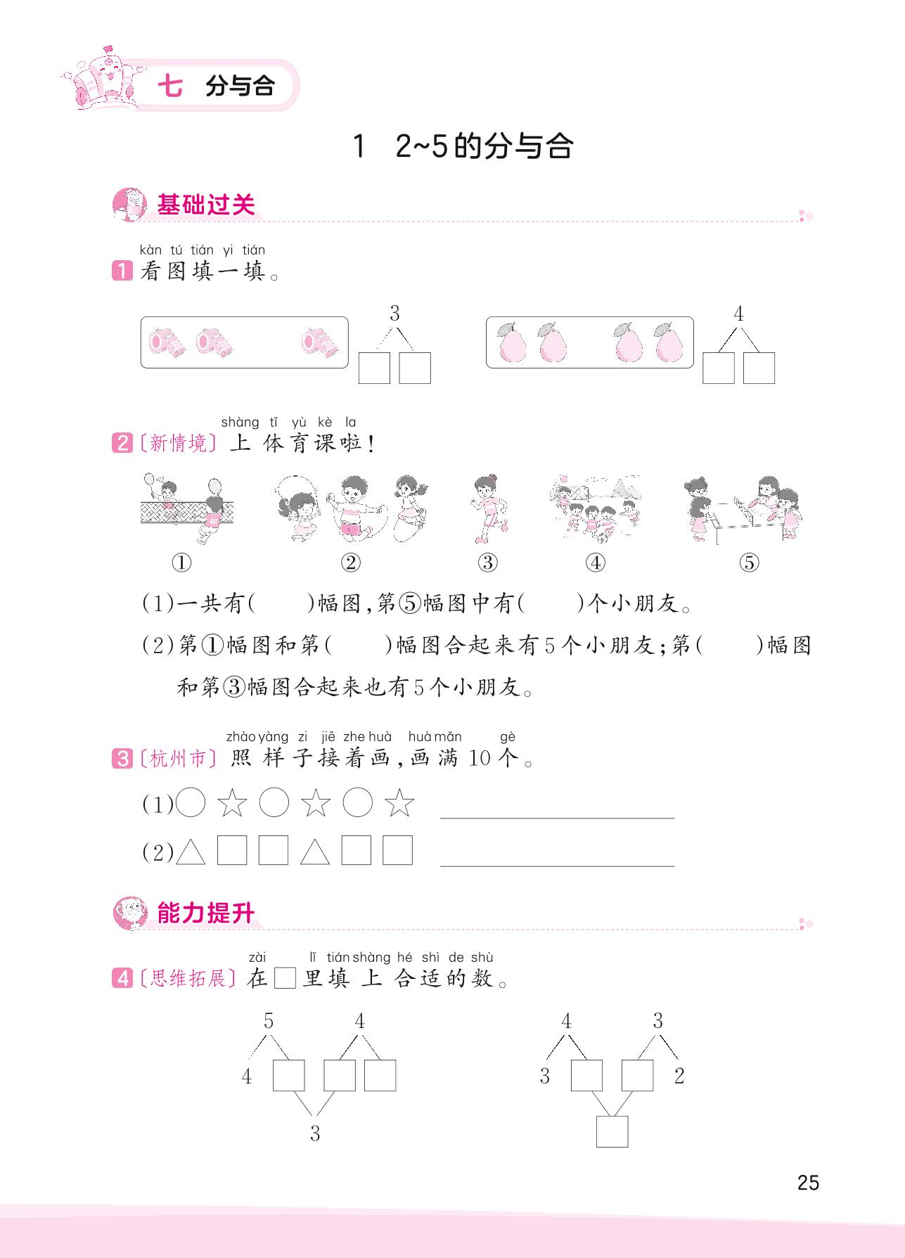 2023上册一年级数学苏教版 七 分与合——1 2~5的分与合