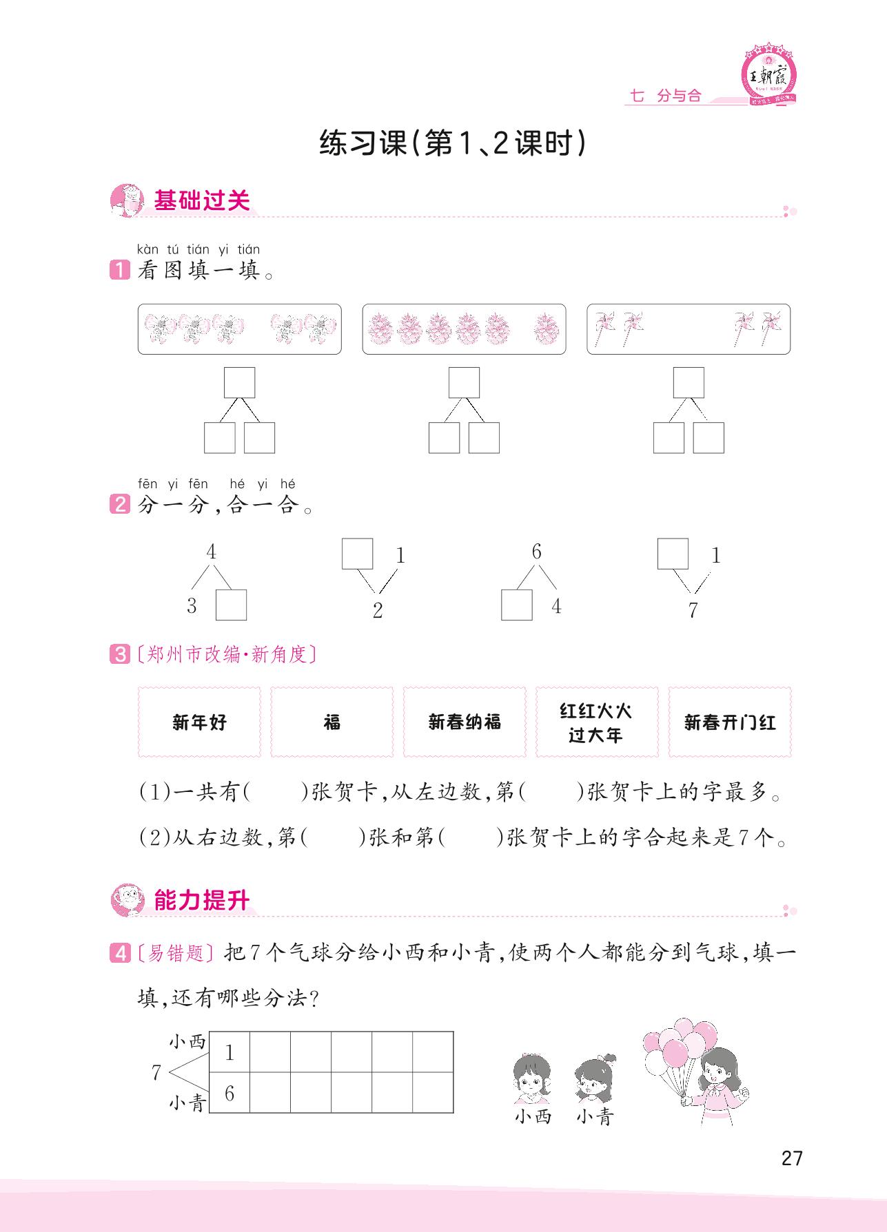 2023上册一年级数学苏教版 七 分与合——练习课(第1、2课时)
