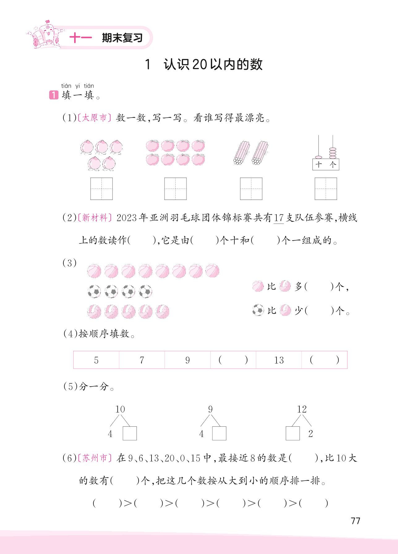 2023上册一年级数学苏教版 十一 期末复习——1 认识20以内的数