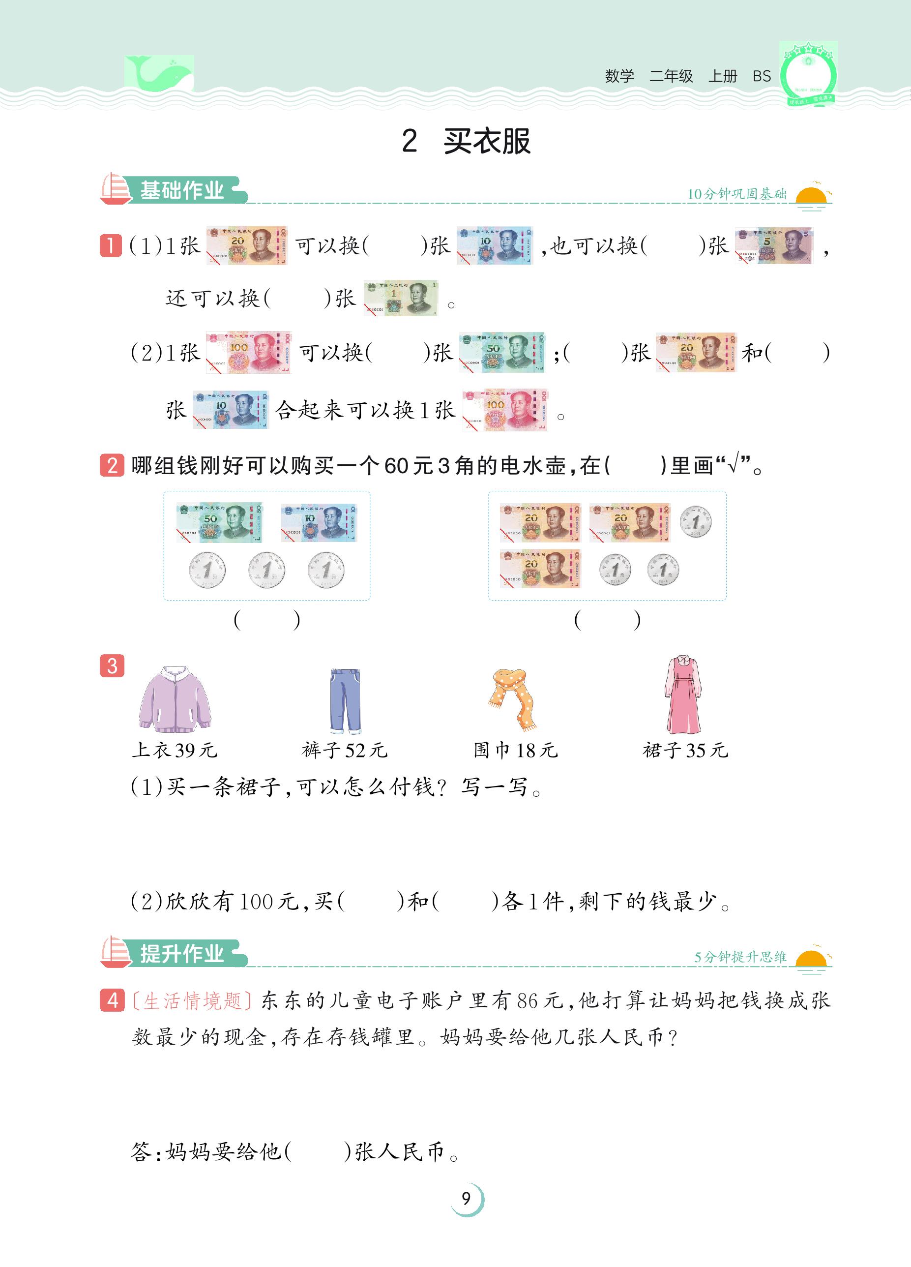 2023上册二年级数学北师版 第二单元 购物——2 买衣服