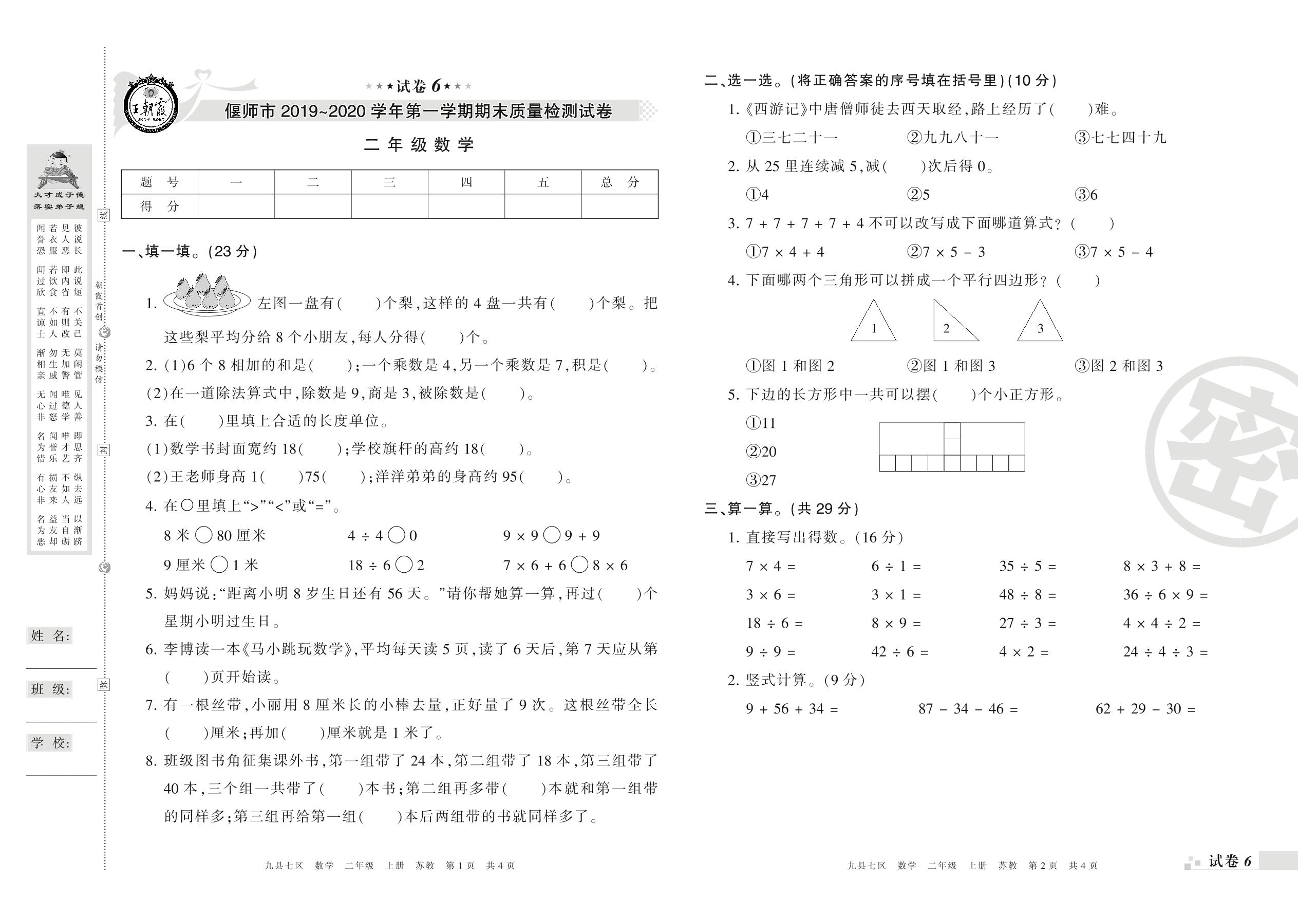 2019-2020学年第一学期偃师市二年级数学试卷(苏教版)【6】