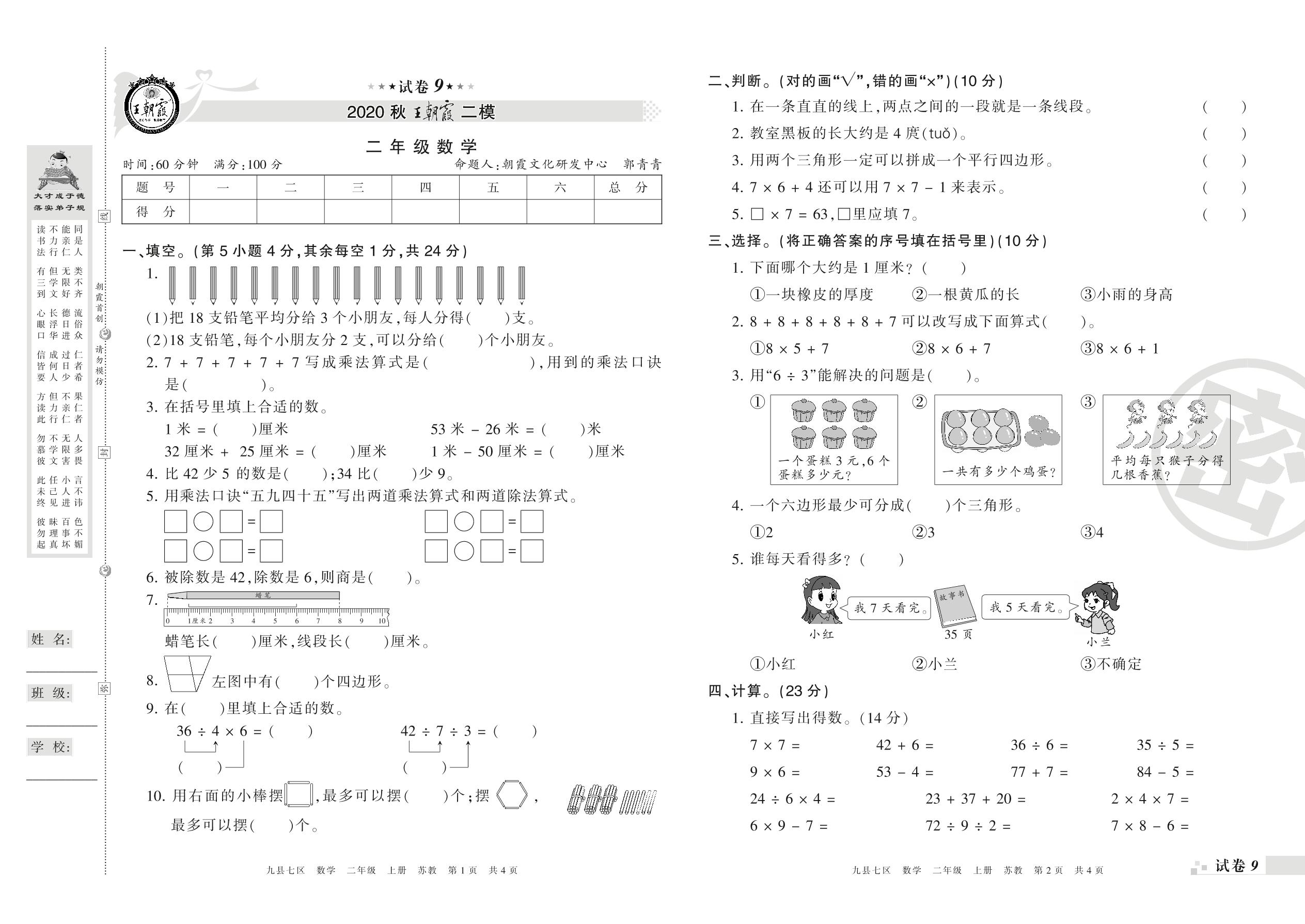 王朝霞期末模拟卷二年级上册数学(苏教版)【9】