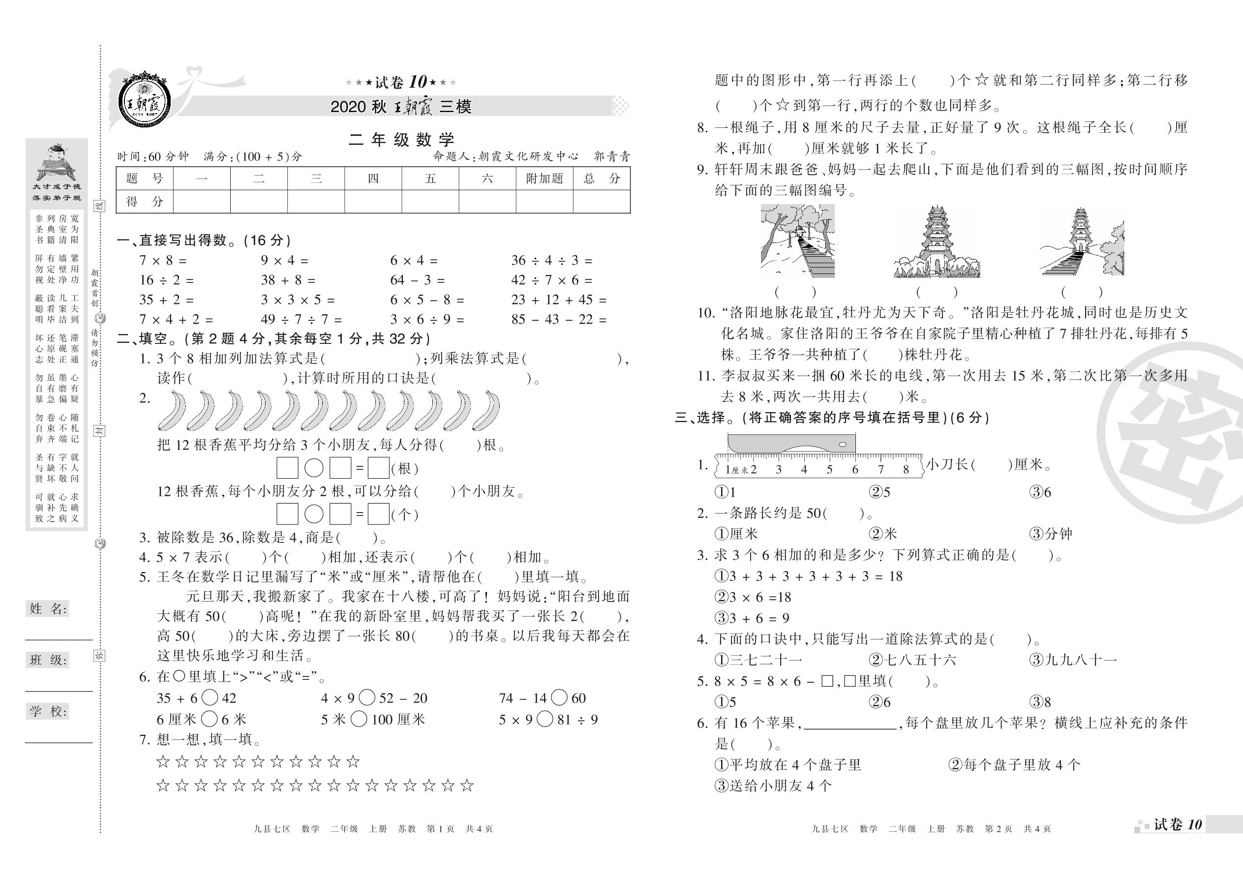 王朝霞期末模拟卷二年级上册数学(苏教版)【10】