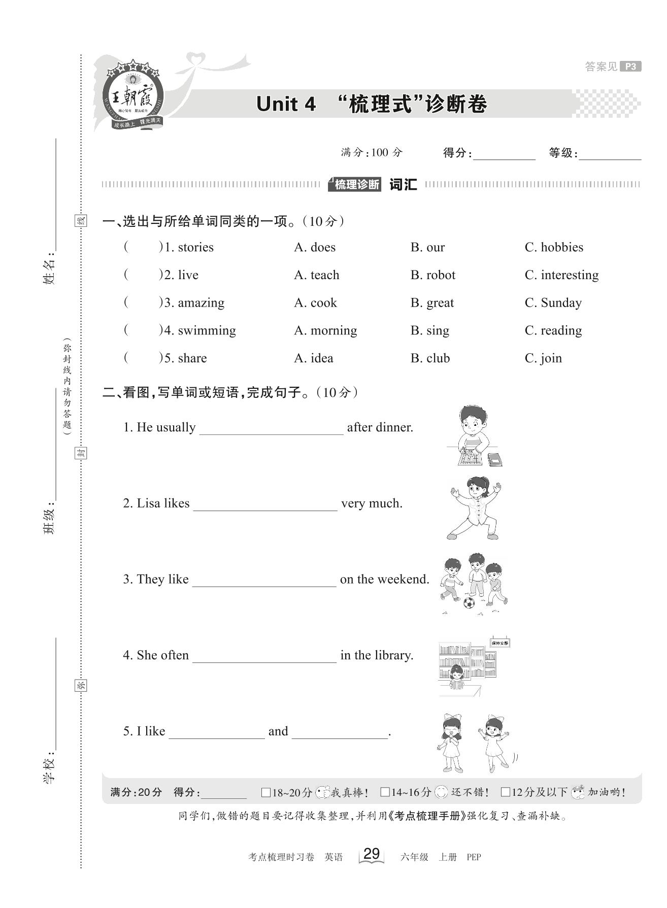 2023上册六年级英语人教PEP版 Unit 4 “梳理式”诊断卷