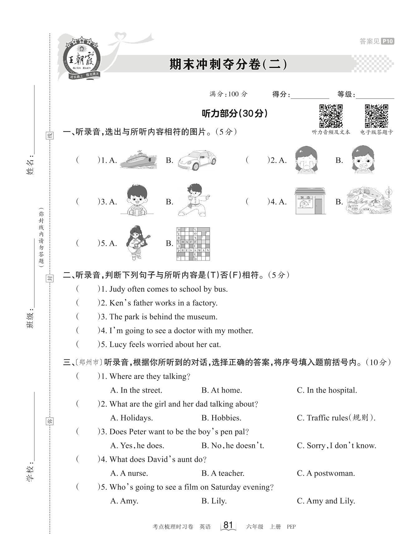 2023上册六年级英语人教PEP版 期末冲刺夺分卷(二)