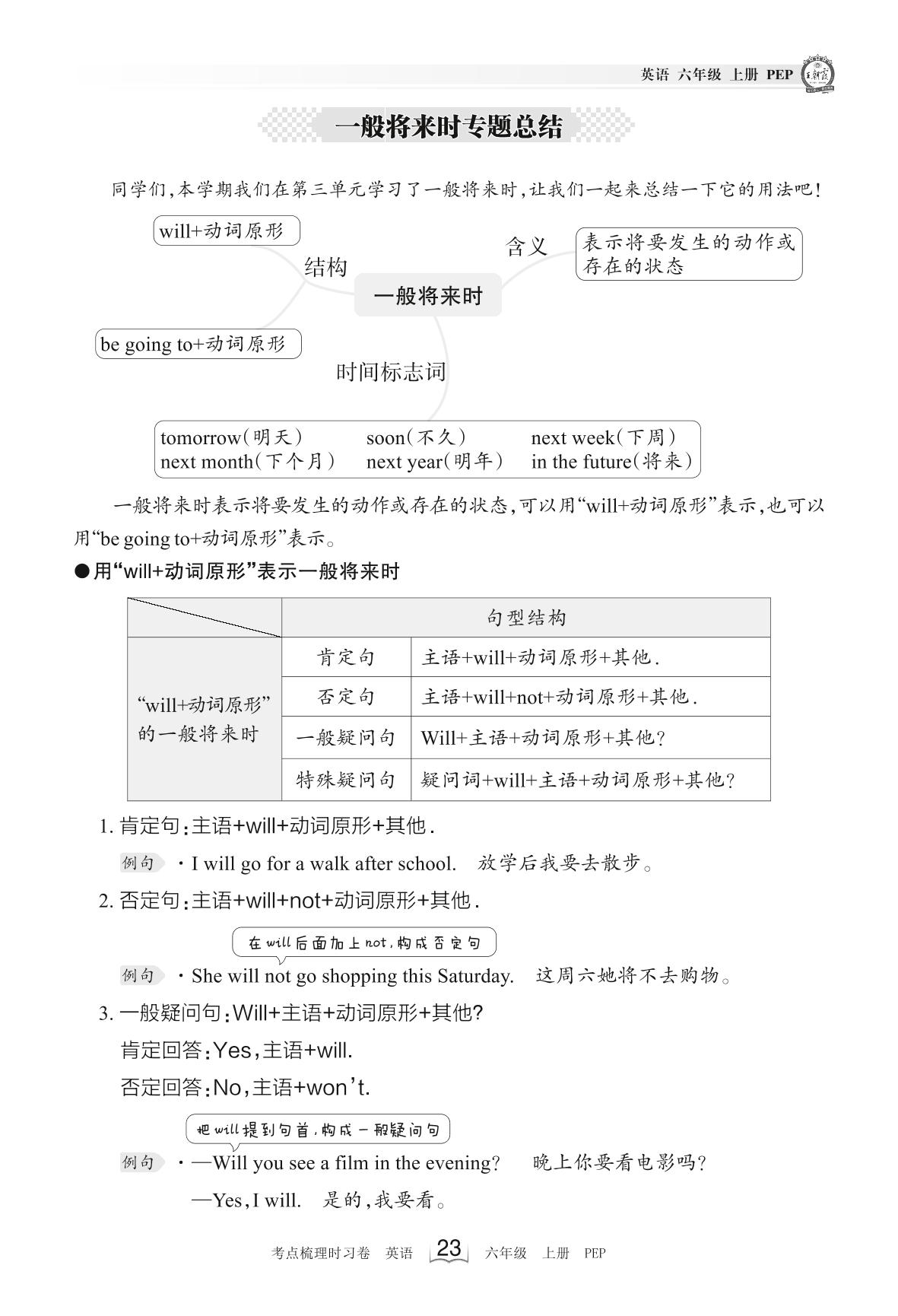 2023上册六年级英语人教PEP版 考点梳理手册——一般将来时专题总结