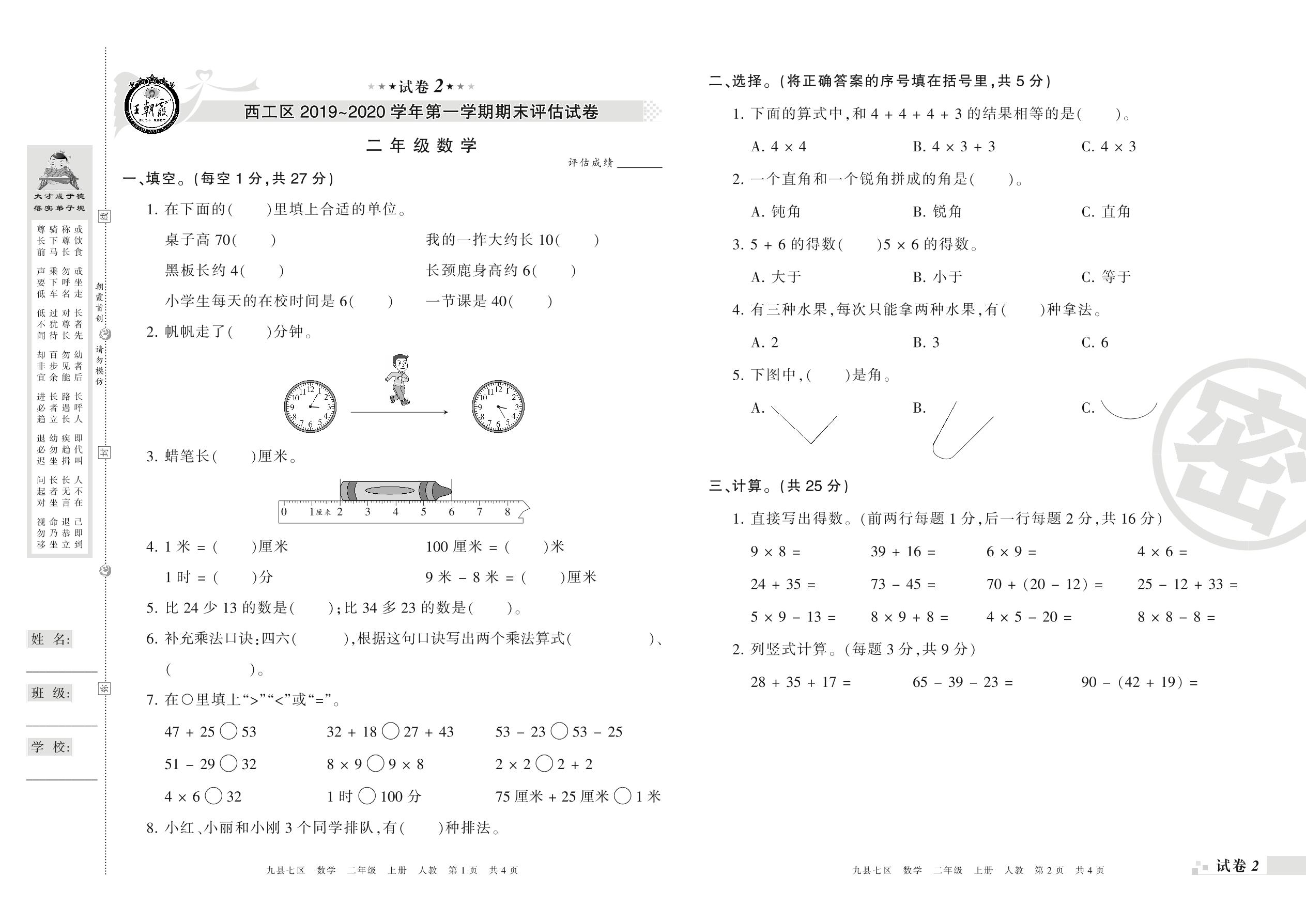 2019-2020学年第一学期洛阳市西工区二年级数学试卷(人教版)【2】