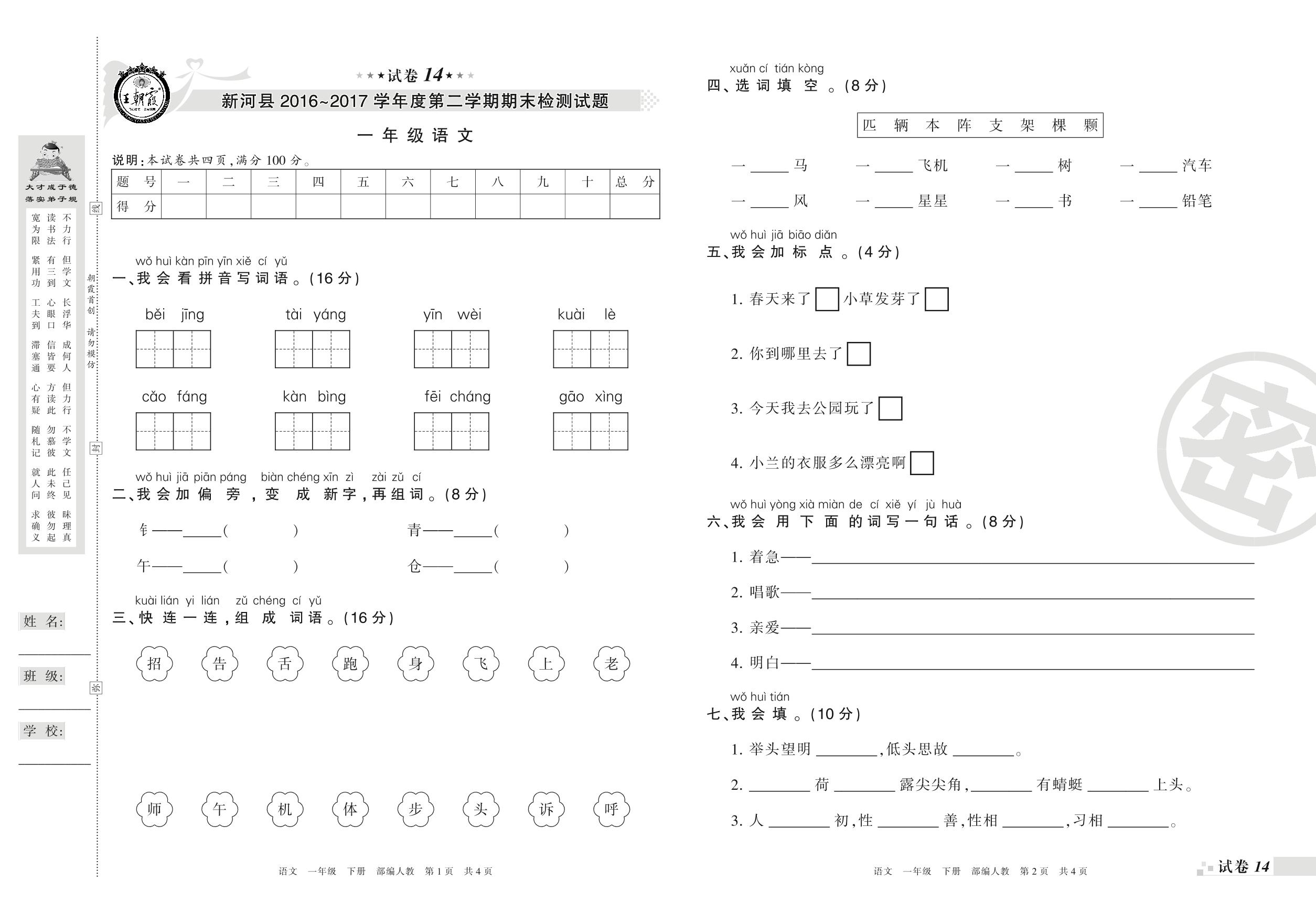 一年级语文人教版下册期末卷