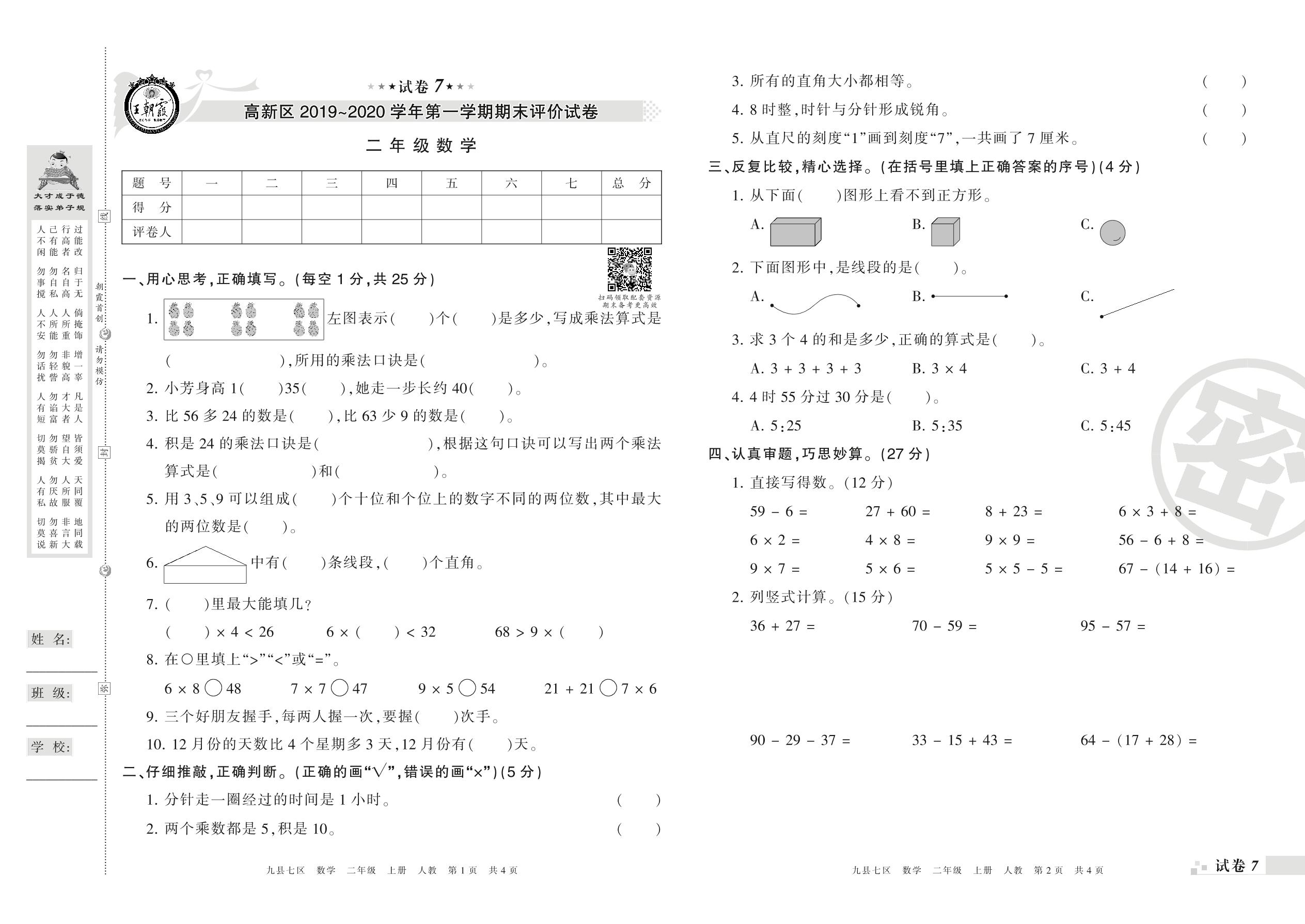 2019-2020学年第一学期洛阳市高新区二年级数学试卷(人教版)【7】