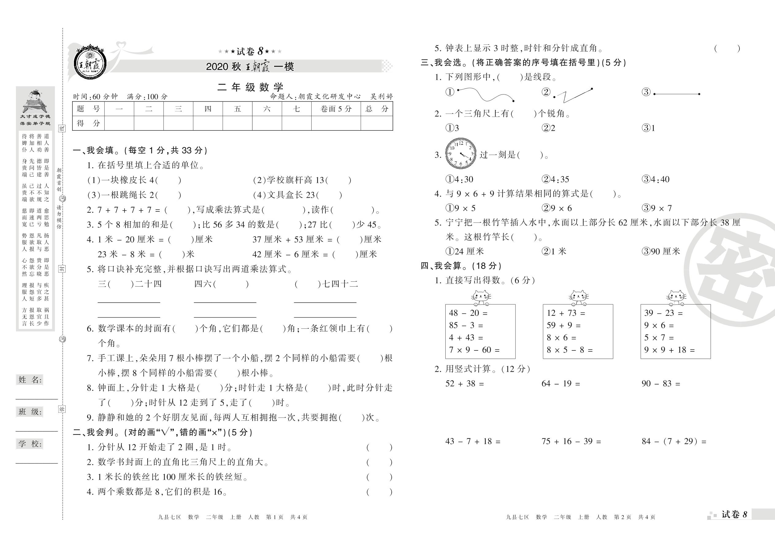王朝霞期末模拟卷二年级上册数学(人教版)【8】