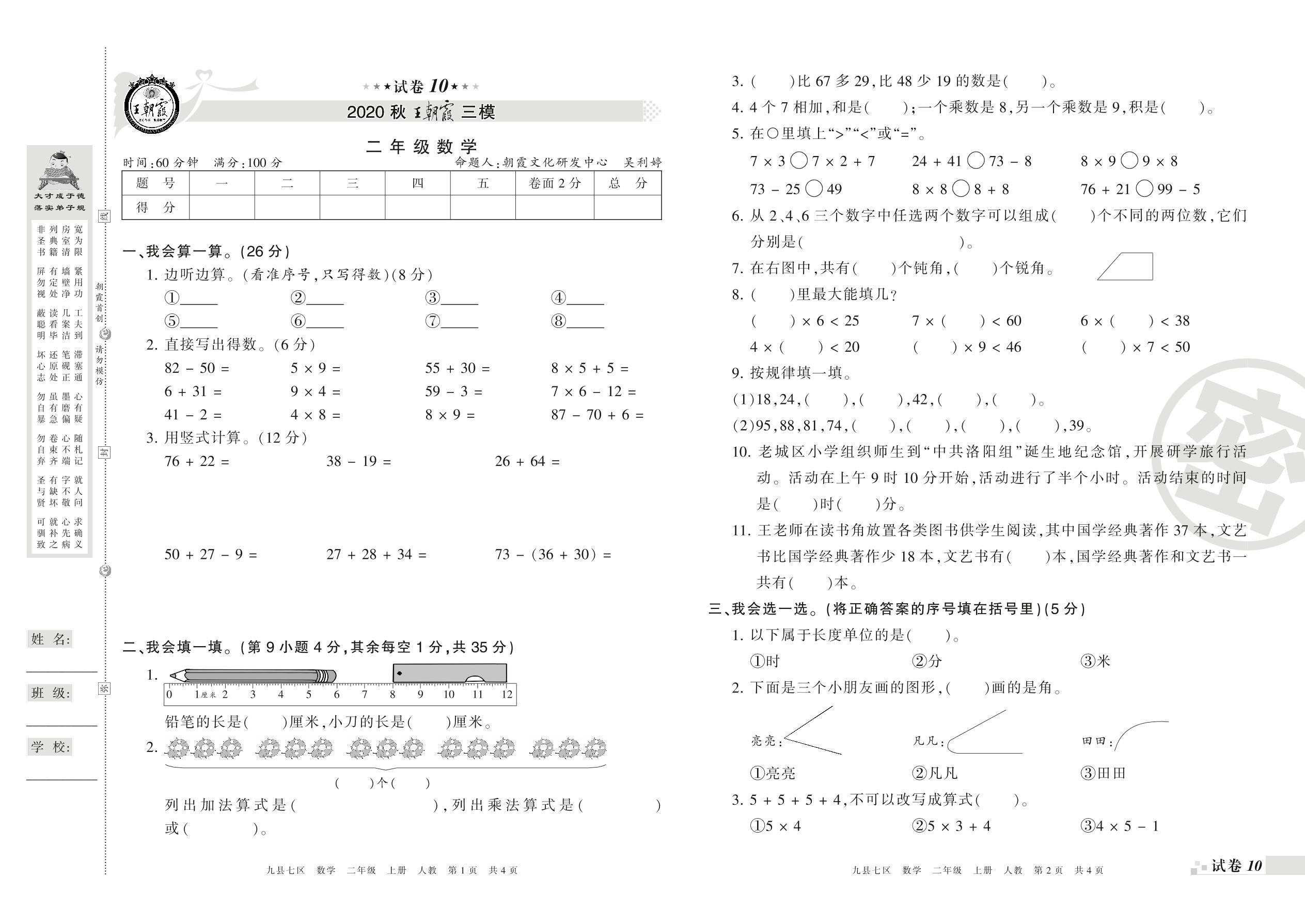 王朝霞期末模拟卷二年级上册数学(人教版)【10】