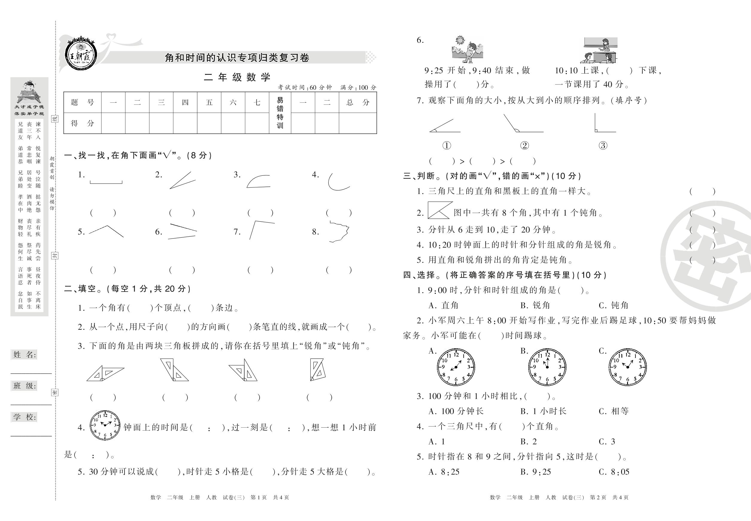 王朝霞期末专项卷——角和时间的认识专项归类复习二年级上册数学(人教版)【3】