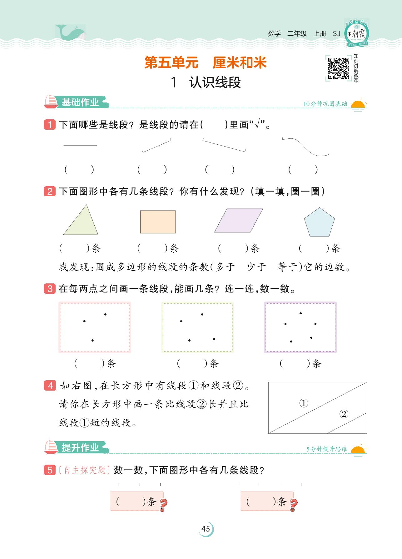 2023上册二年级数学苏教版 第五单元 厘米和米——1 认识线段