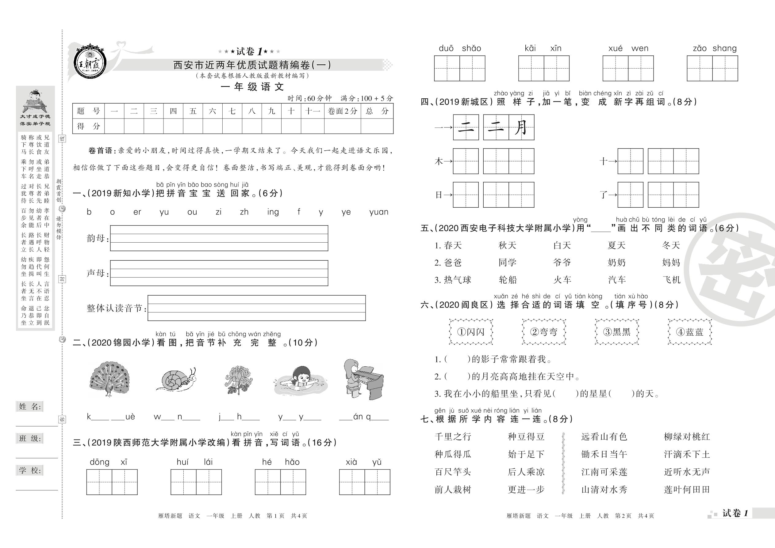 西安市近两年优质试题精编卷(一)一年级上册语文(人教版)【1】