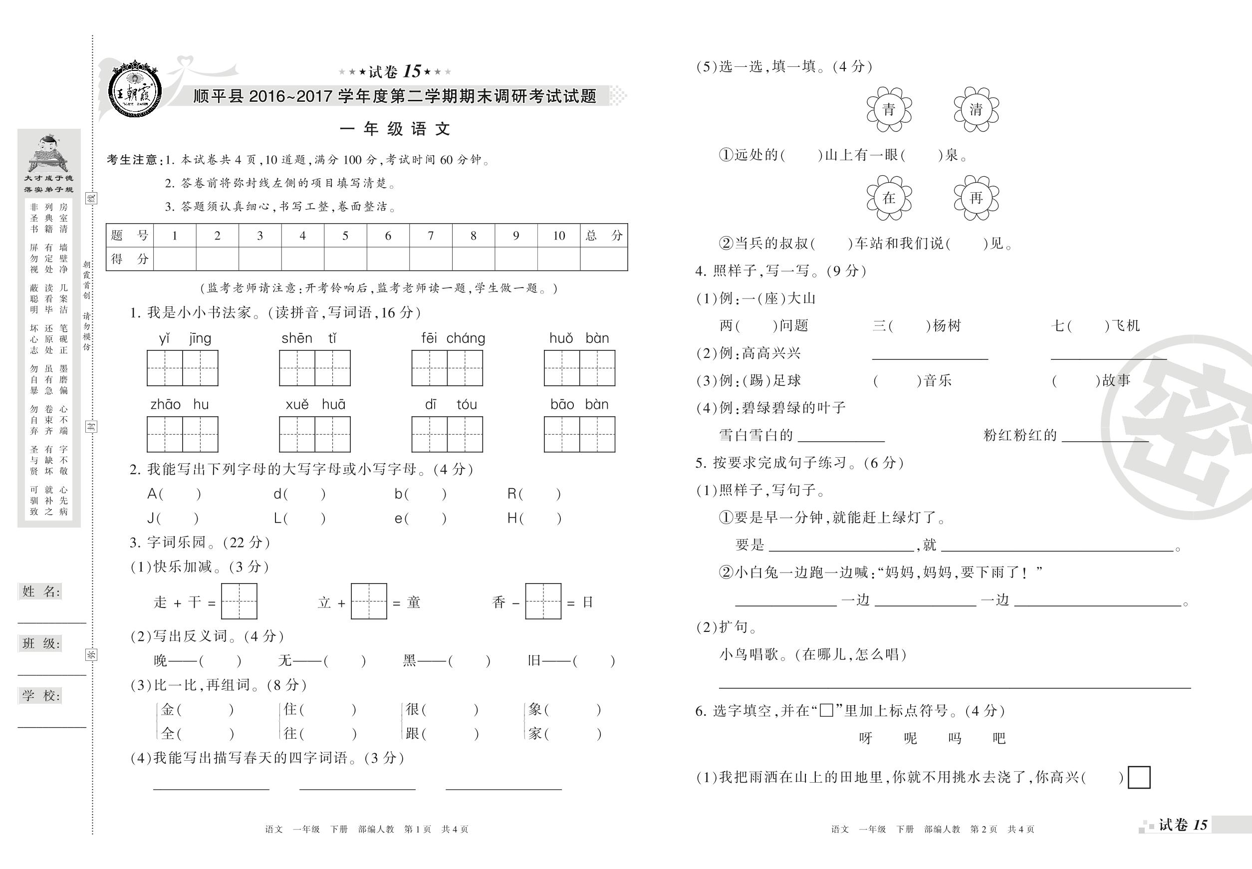 2016-2017学年第二学期保定市顺平县一年级语文试卷(人教版)【15】