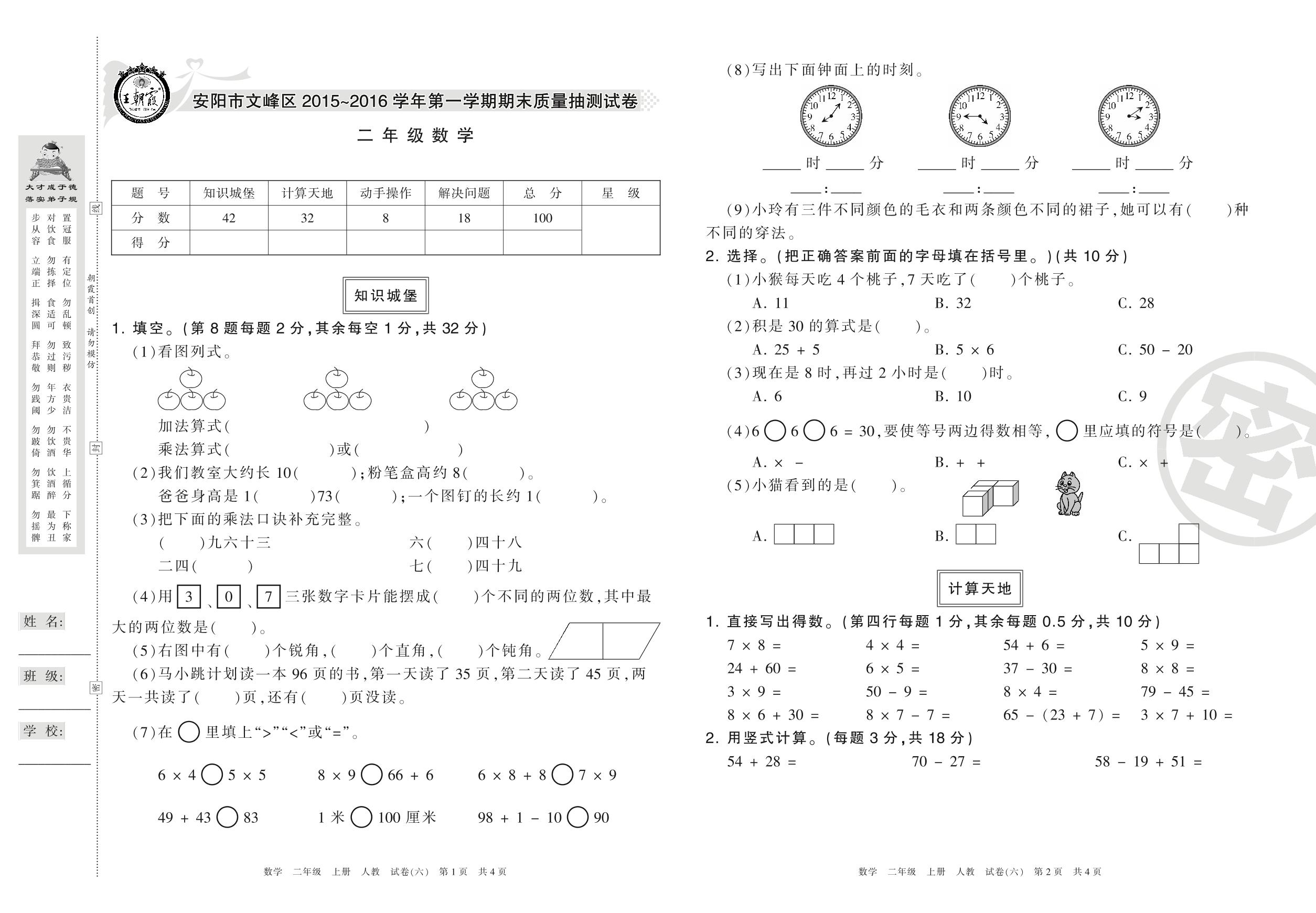 2015-2016学年第一学期安阳市文峰区二年级数学试卷(人教版)【6】