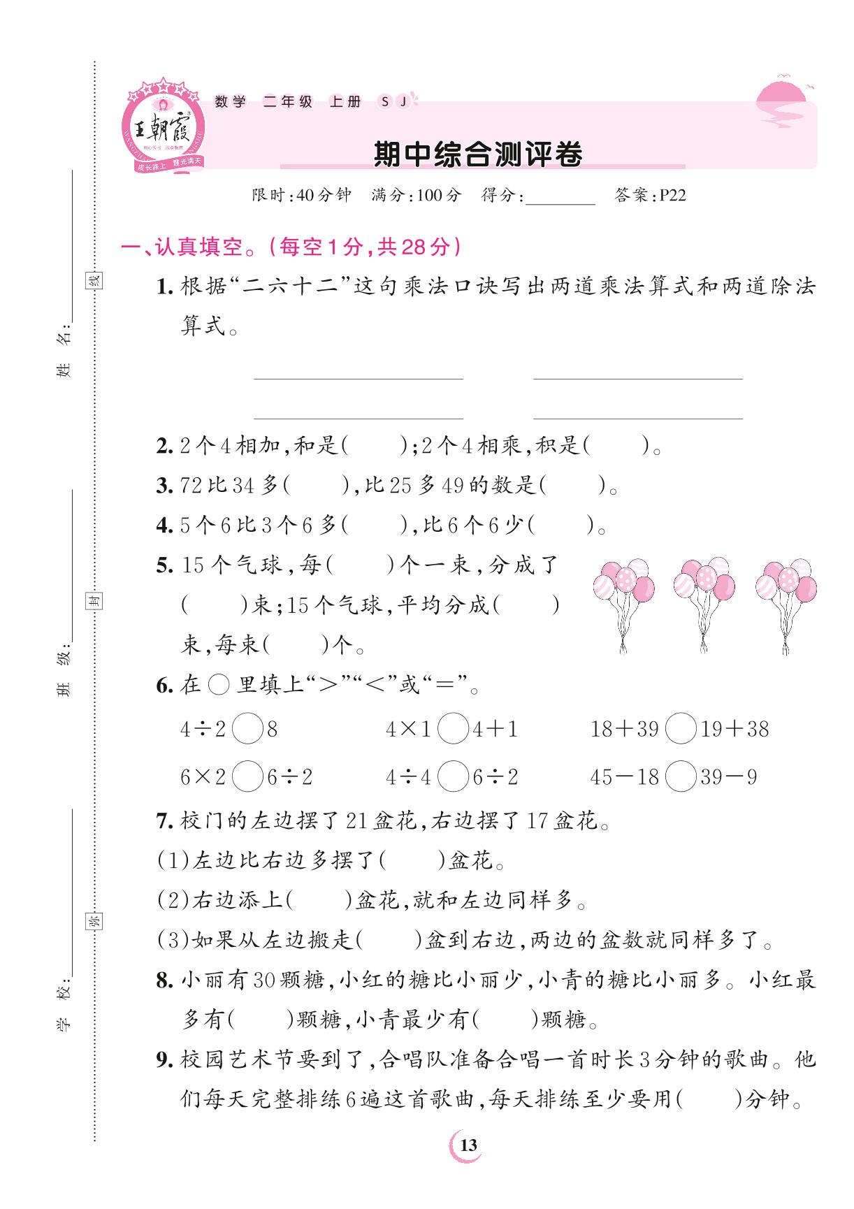 二年级数学苏教版上册期中卷