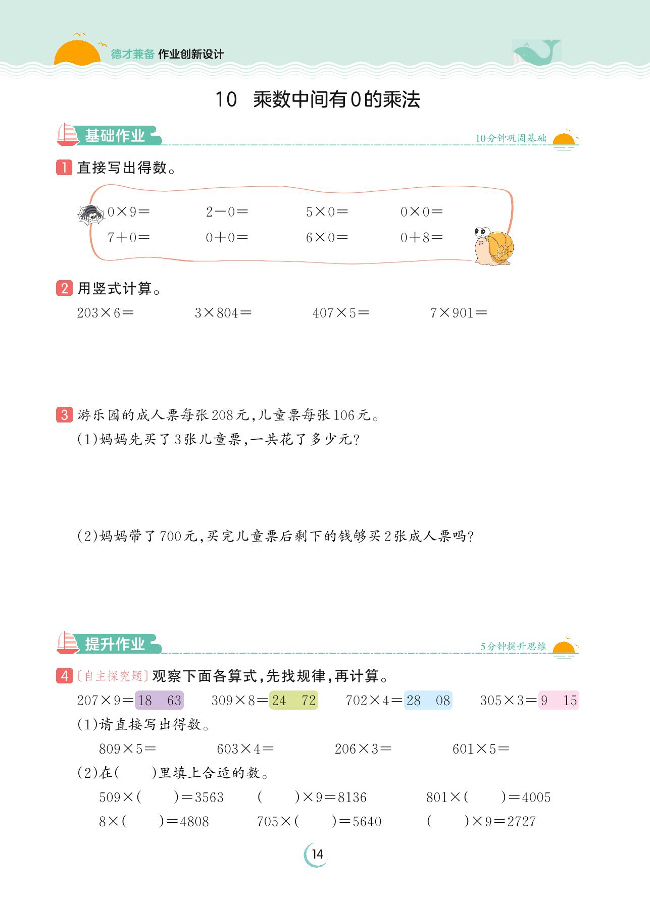 2023上册三年级数学苏教版 第一单元 两、三位数乘一位数——10 乘数中间有0的乘法