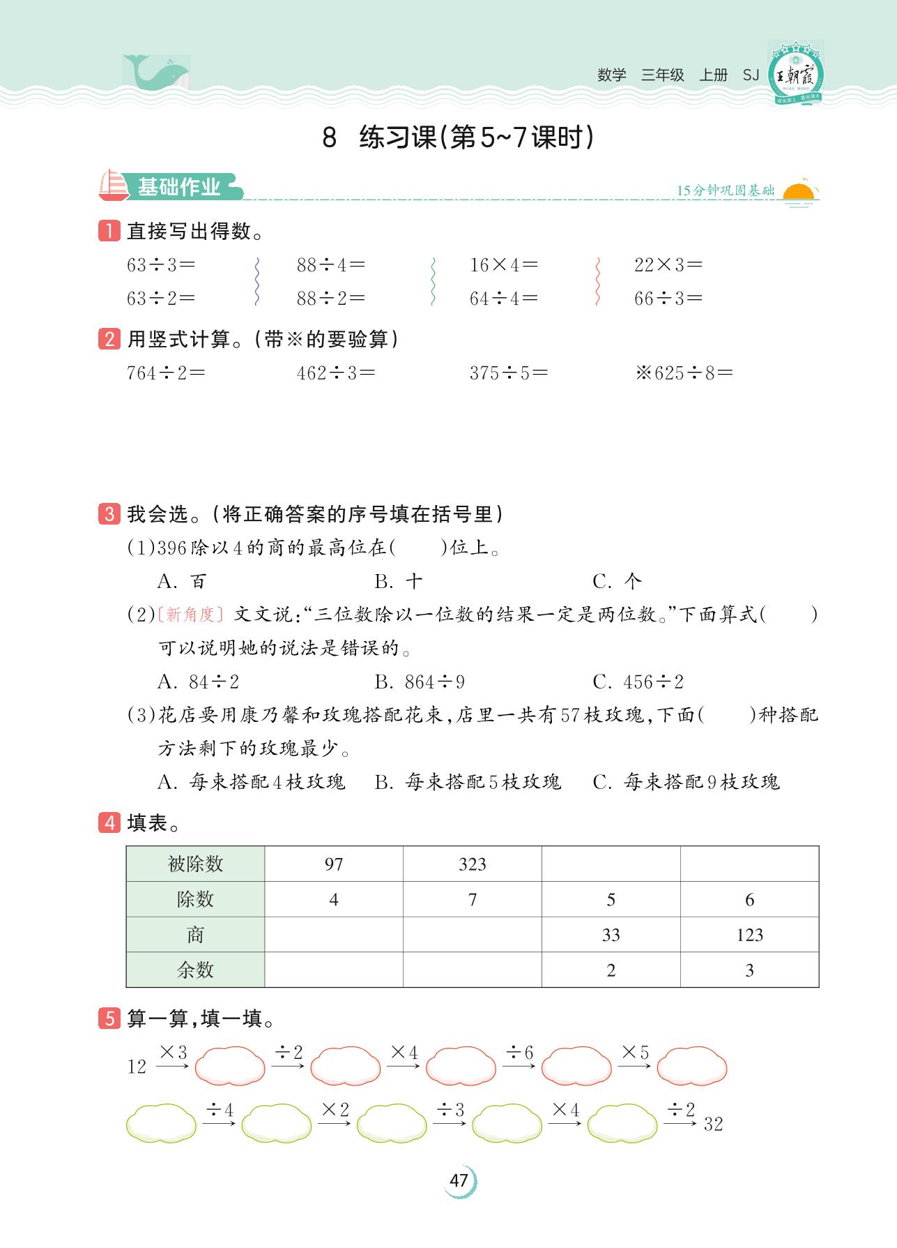 2023上册三年级数学苏教版 第四单元 两、三位数除以一位数——8 练习课(第5~7课时)