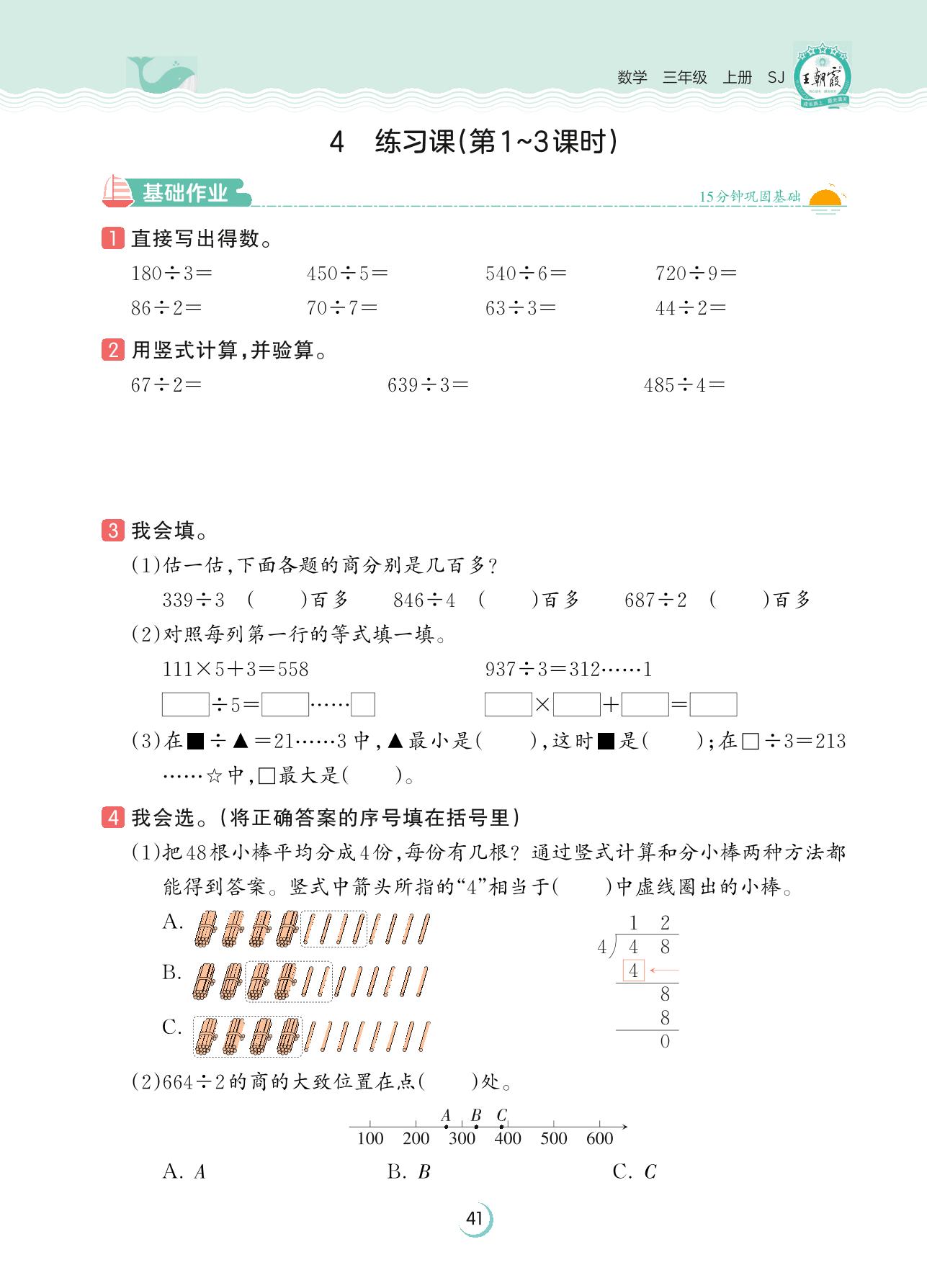 2023上册三年级数学苏教版 第四单元 两、三位数除以一位数——4 练习课(第1~3课时)