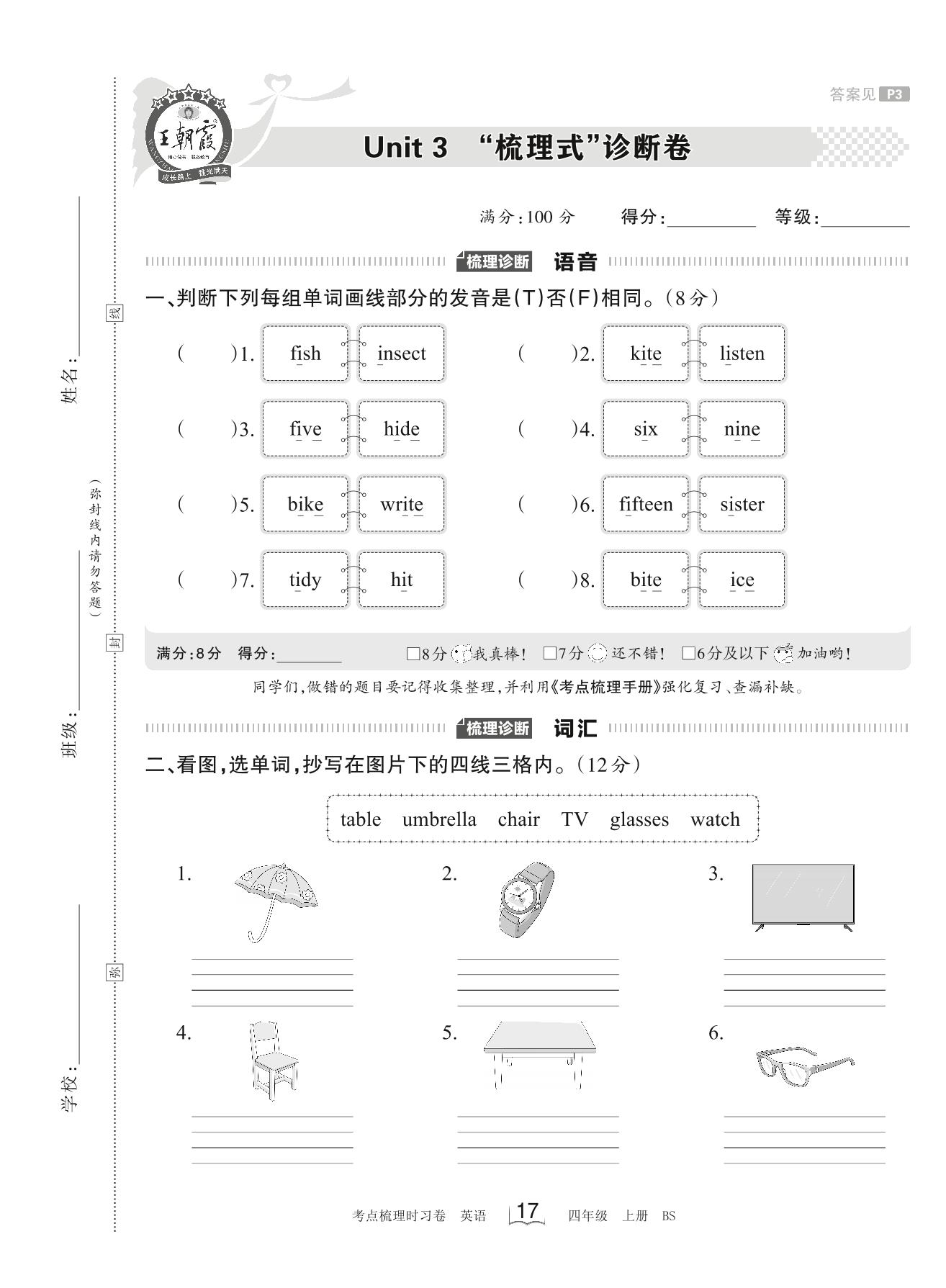 2023上册四年级英语北师版 Unit 3 “梳理式”诊断卷