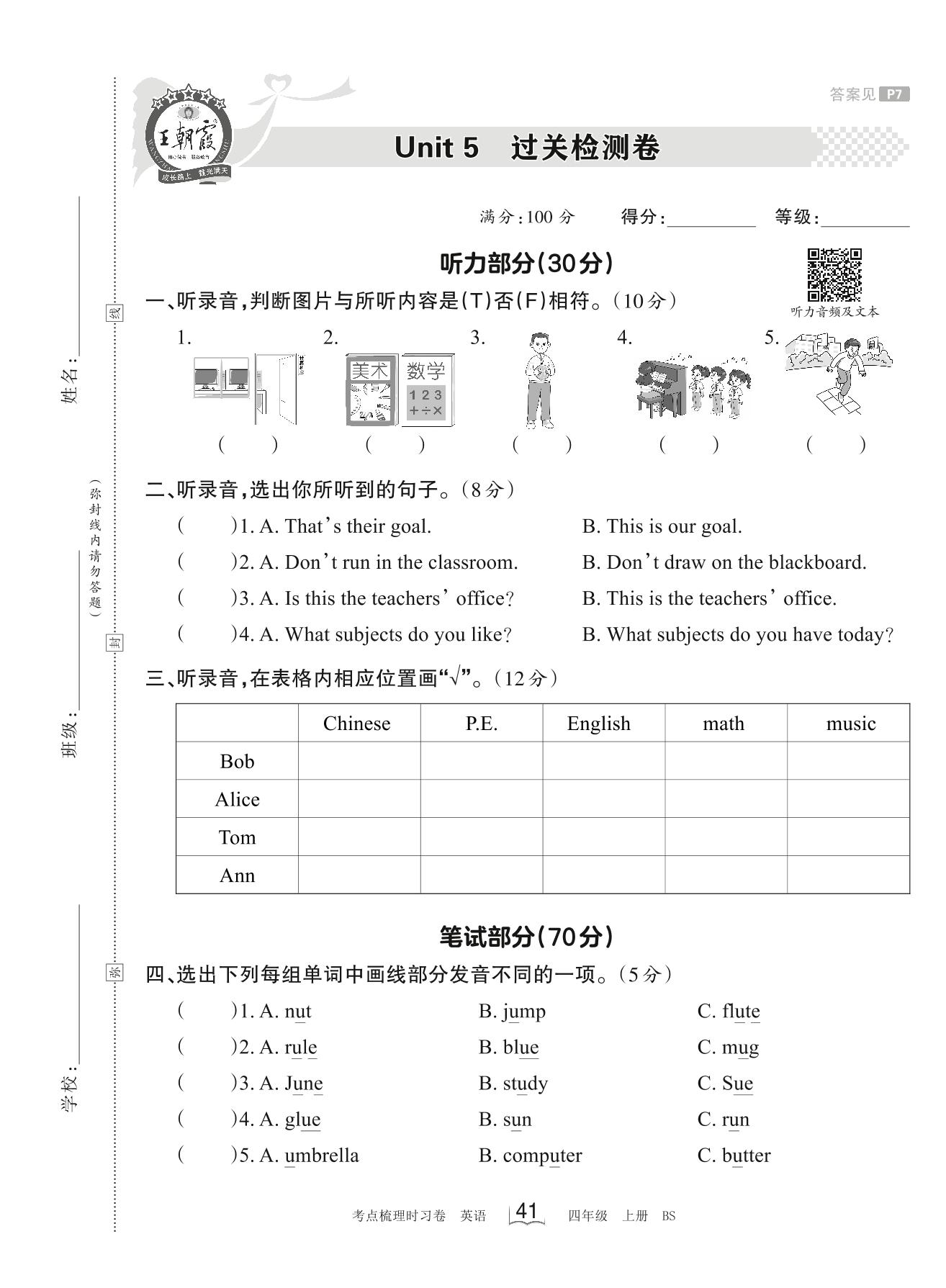 2023上册四年级英语北师版 Unit 5 过关检测卷