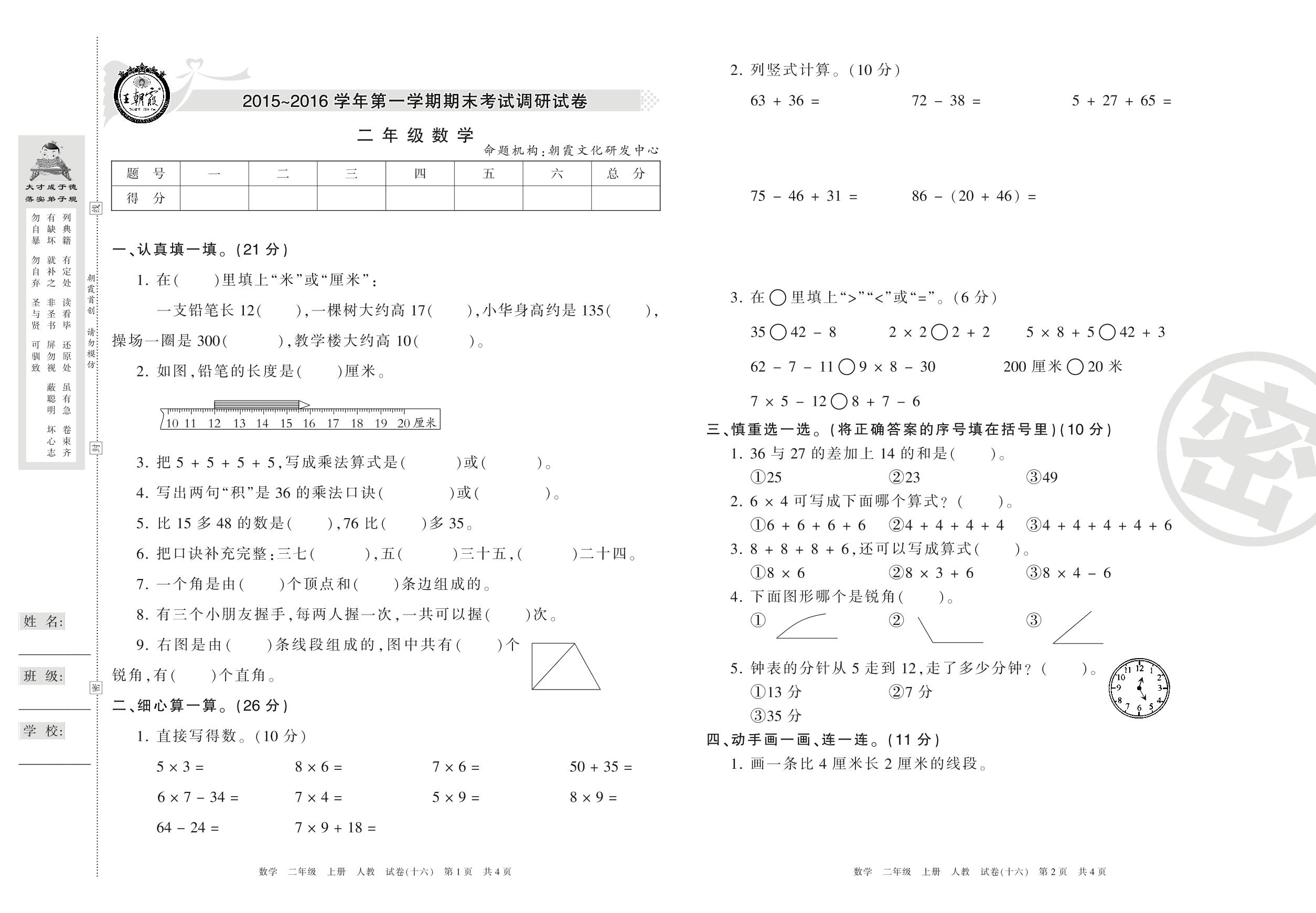 王朝霞期末调研卷二年级上册数学(人教版)【16】