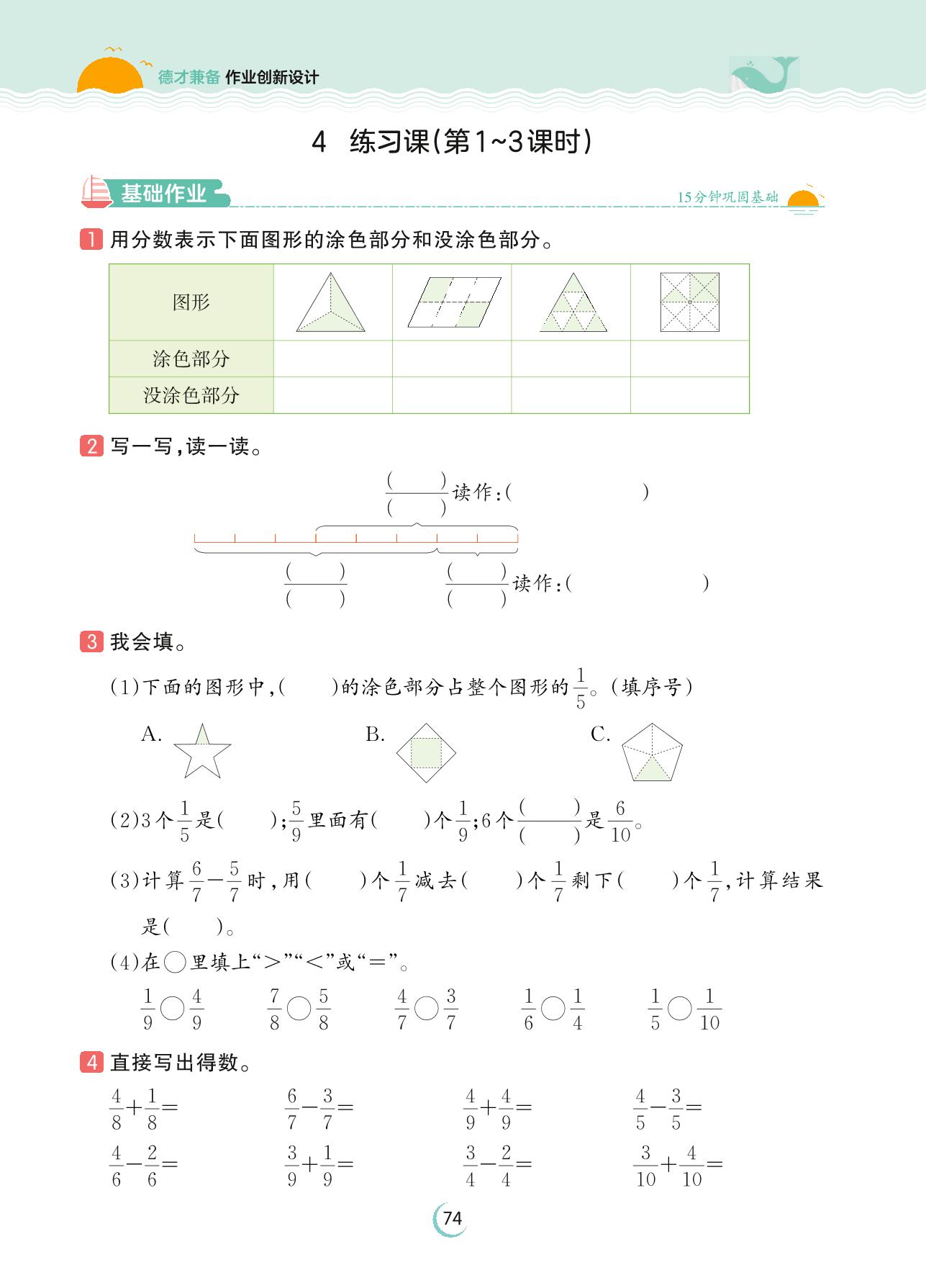 2023上册三年级数学苏教版 第七单元 分数的初步认识(一)——4 练习课(第1~3课时)