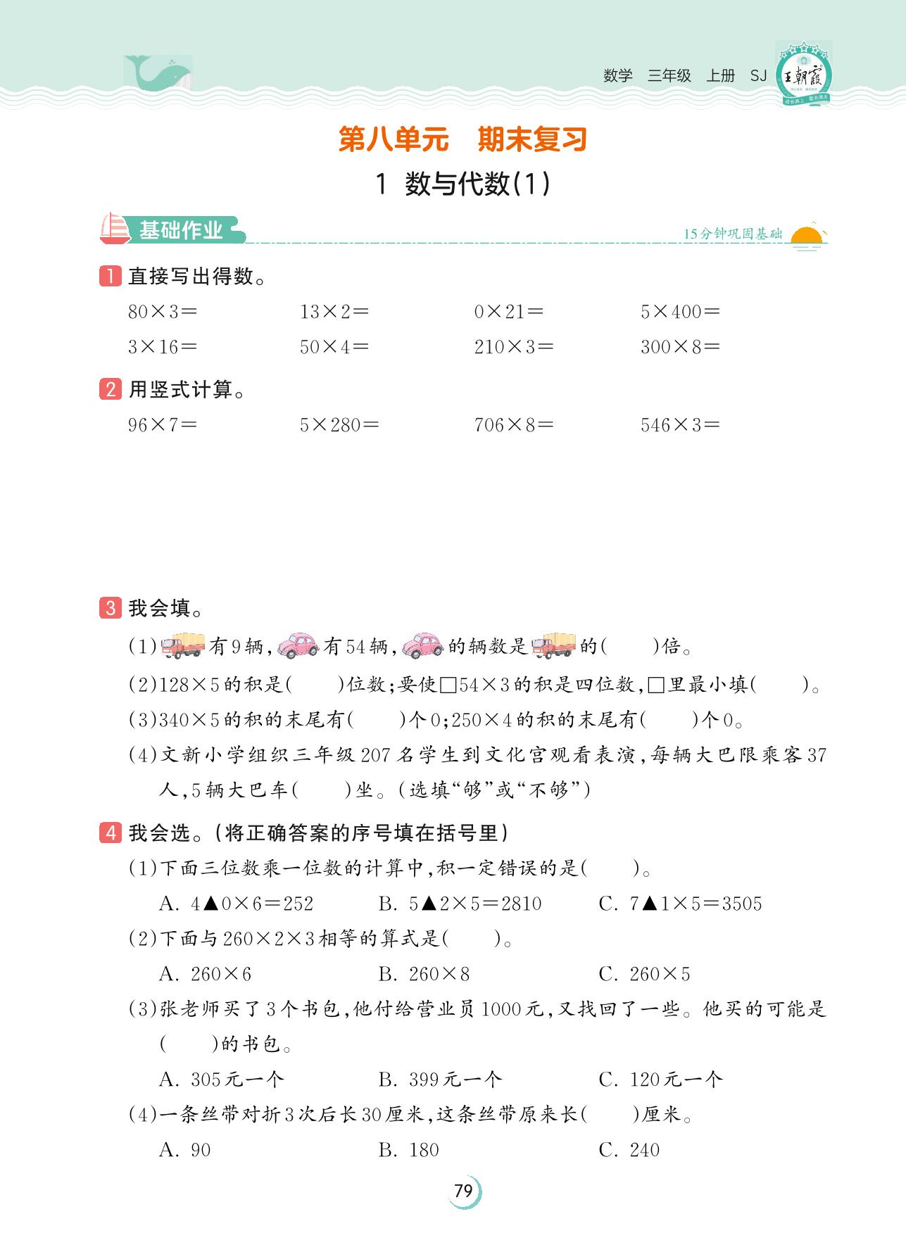 2023上册三年级数学苏教版 第八单元 期末复习——1 数与代数(1)