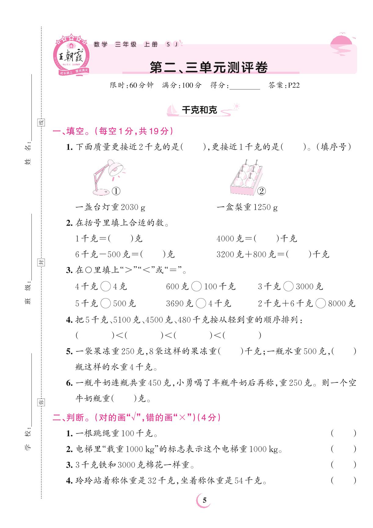 2023上册三年级数学苏教版 第二、三单元测评卷