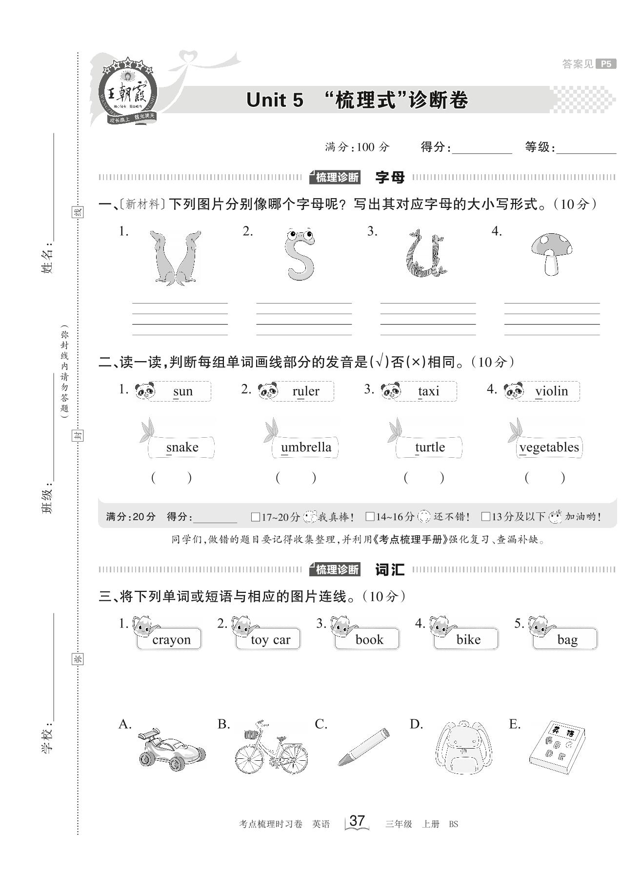 2023上册三年级英语北师版 Unit 5 “梳理式”诊断卷