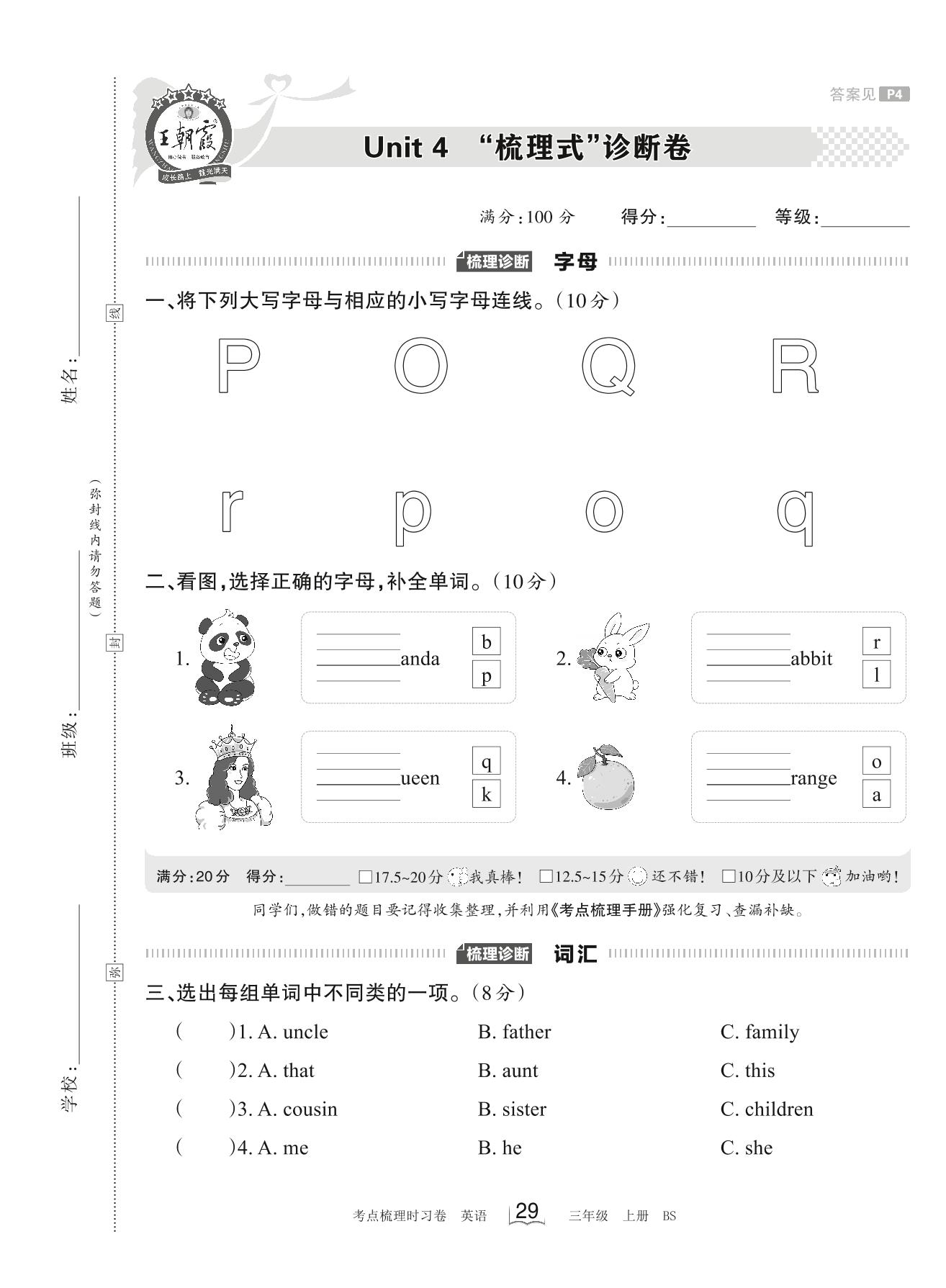 2023上册三年级英语北师版 Unit 4 “梳理式”诊断卷