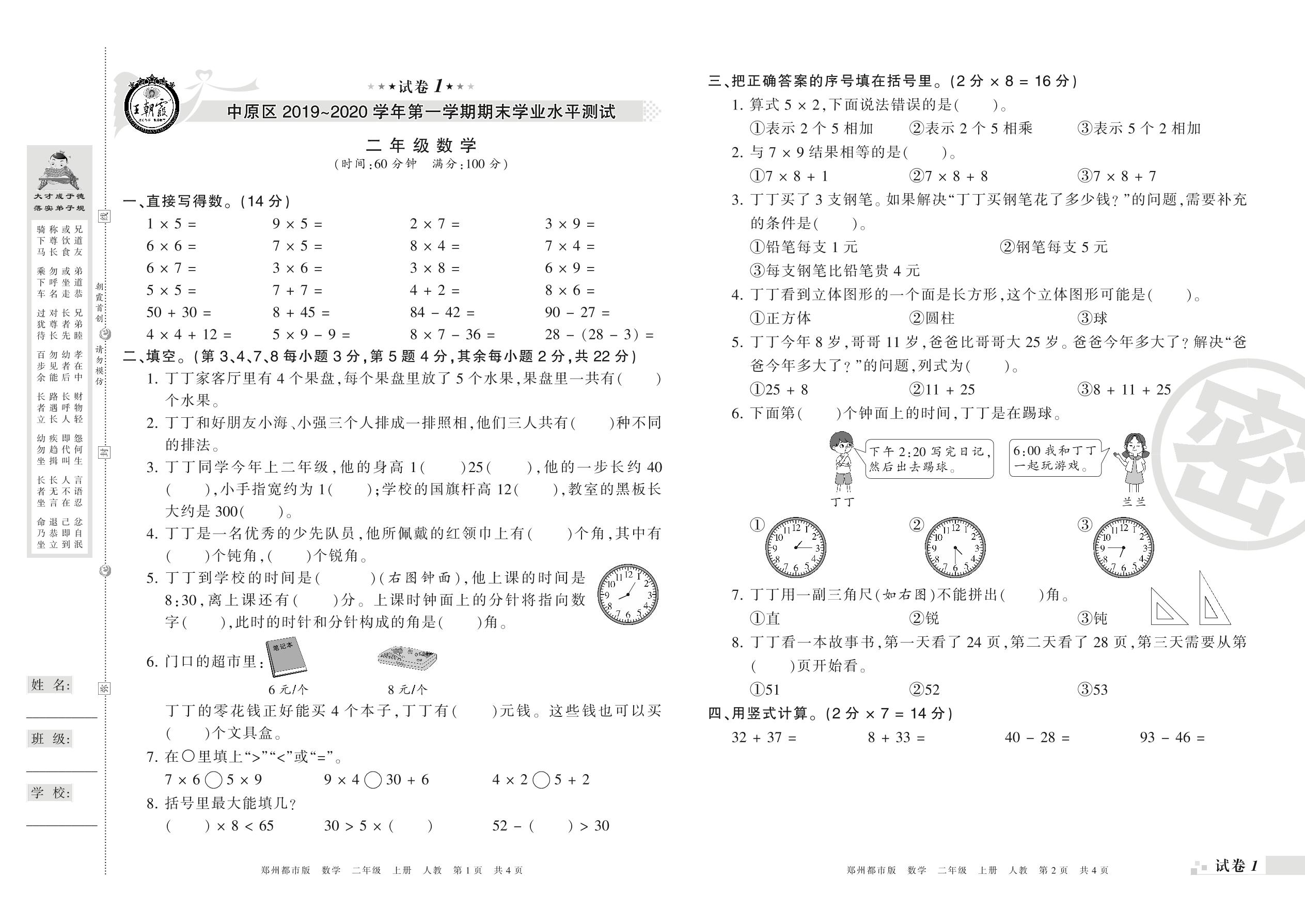 2019-2020学年第一学期郑州市中原区二年级数学试卷(人教版)【1】