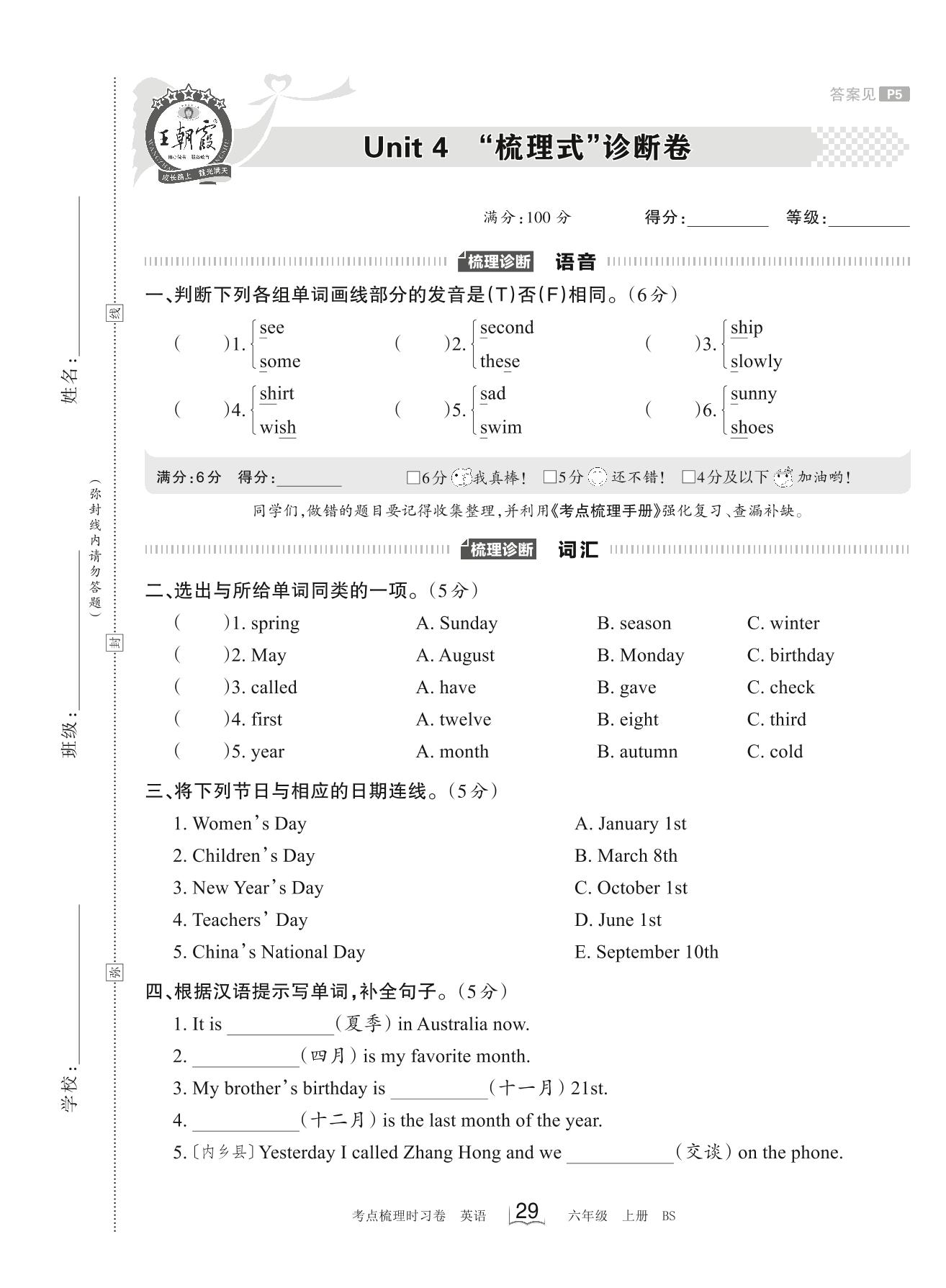 2023上册六年级英语北师版 Unit 4 “梳理式”诊断卷