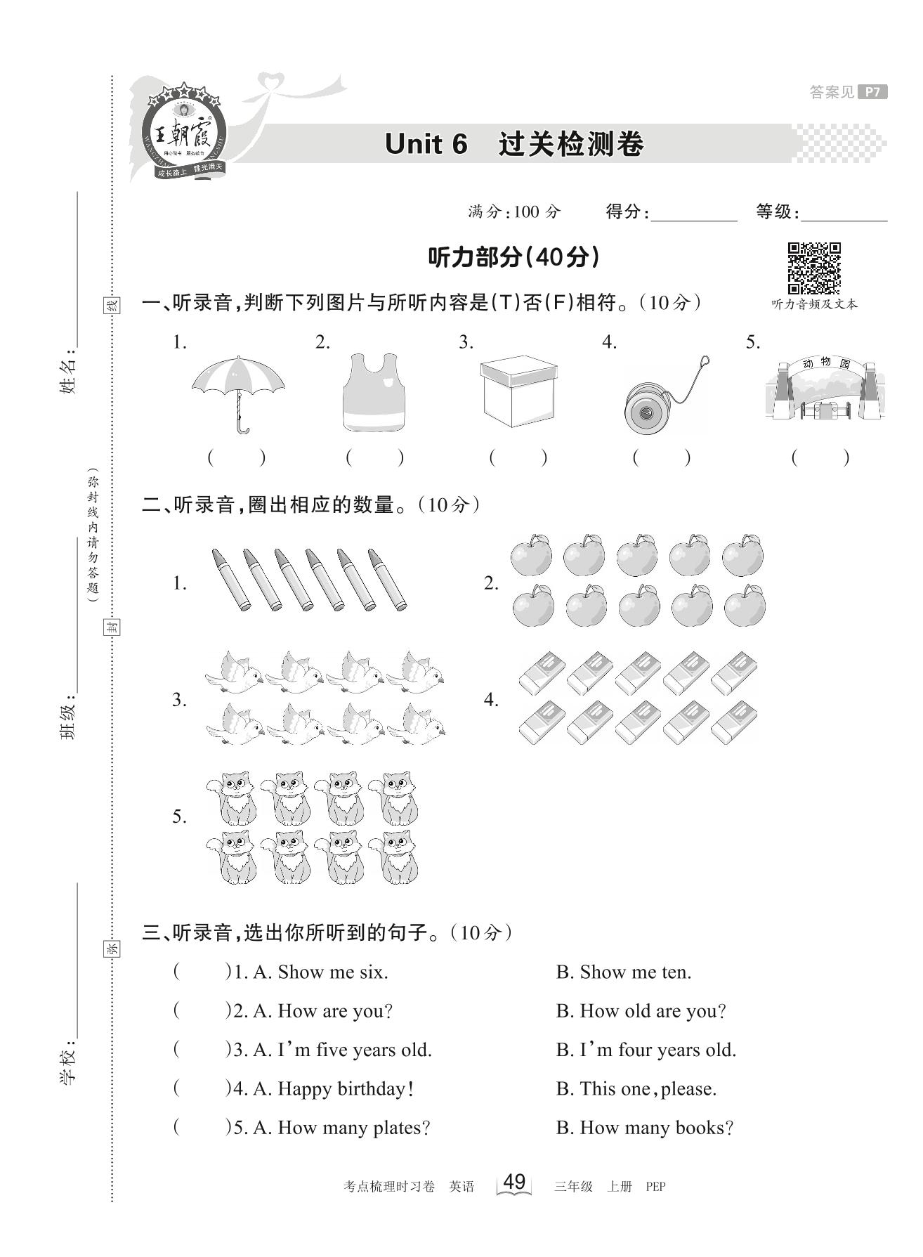 三年级英语人教PEP版(三起始)上册单元卷