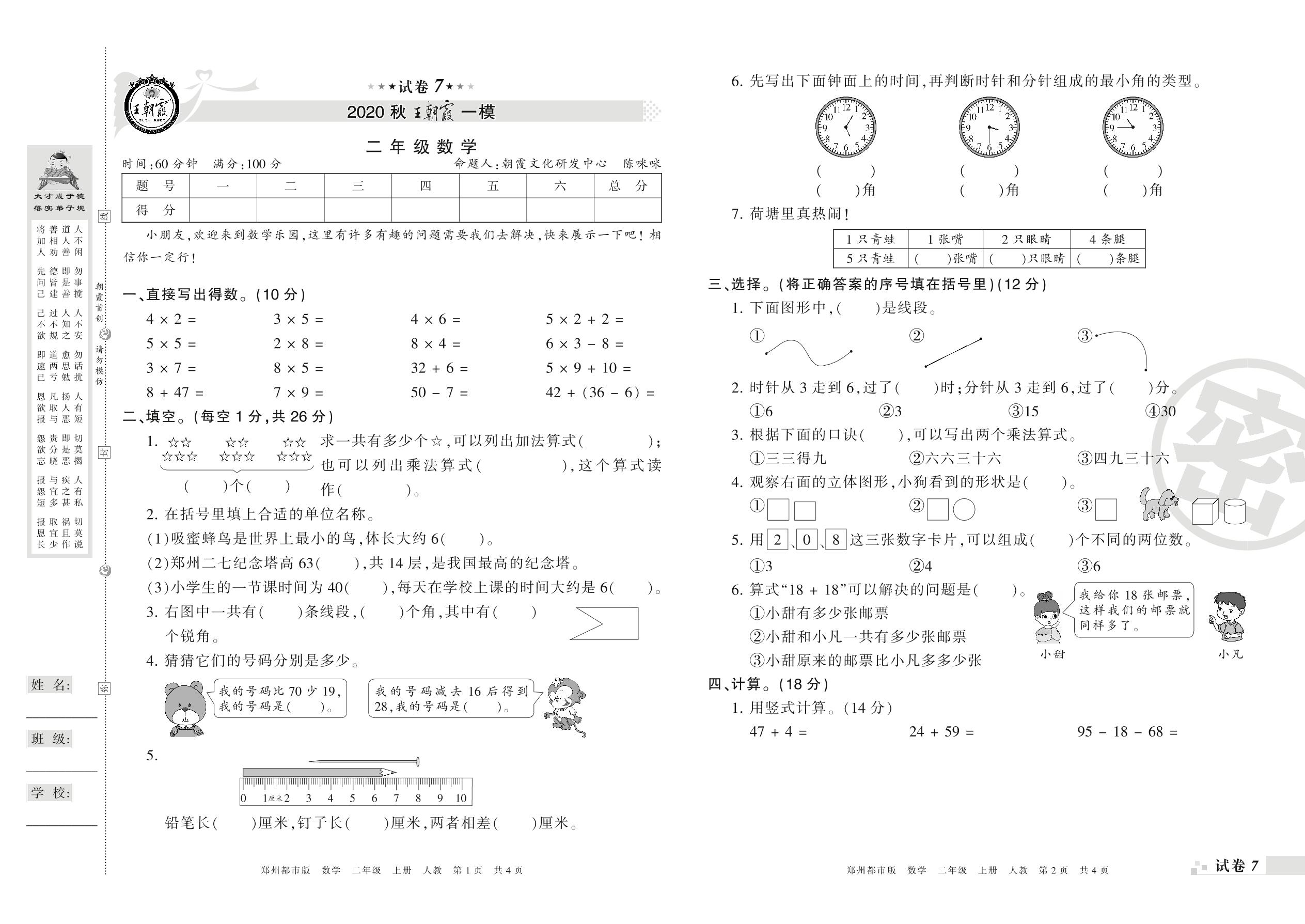 王朝霞期末模拟卷二年级上册数学(人教版)_R21080390415【7】