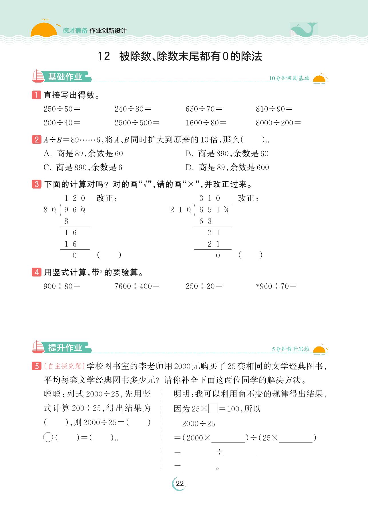 2023上册四年级数学苏教版 第二单元 两、三位数除以两位数——12 被除数、除数末尾都有0的除法