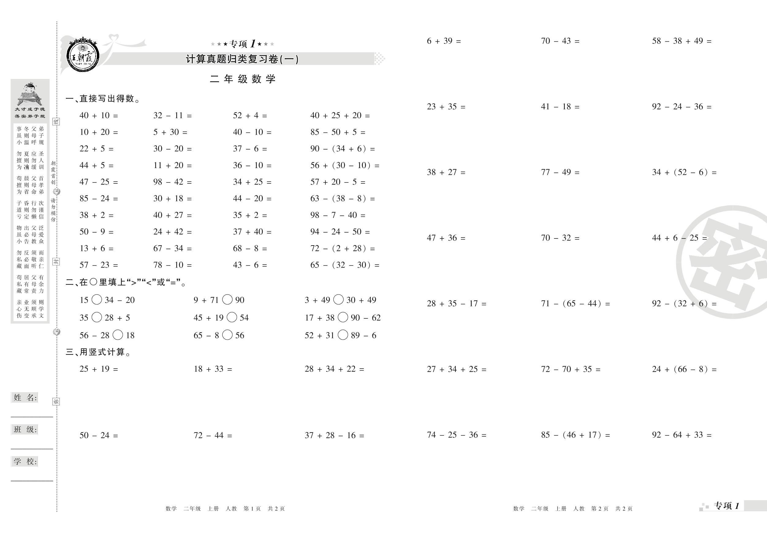 王朝霞期末专项卷——计算真题归类复习二年级上册数学(人教版)_R21080390433【0】